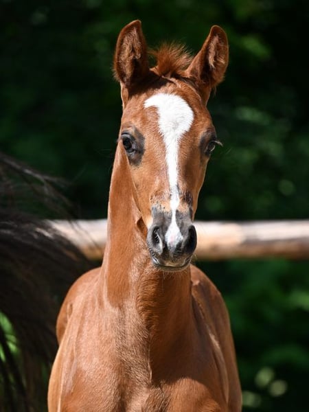 Typvoller Jährlingshengst von Bon Esprit aus einer Dimaggio-Mutter, geboren 2025. Ein moderner Dunkelfuchs mit auffälliger Blesse, zatrem Kopf und insgesamt nach oben konstruierter, sportlicher Erscheinung. Er wächst mit gleichaltrigen Hengsten auf und zeigt sich im Umgang freundlich, aktuell noch etwas zurückhaltend und mit einem gesunden Maß an Vorsicht. Bewegungsseitig überzeugt er mit elastischen, bergauf angelegten Grundgangarten und einem leichtfüßigen fast tänzerischen Bewegungsablauf. Altersgemäß steht er noch am Anfang seiner Entwicklung, bringt jedoch eine sehr interessante Grundlage für den Dressursport und die Zucht mit. Der Hengst wurde als Fohlen prämiert. Aufgrund des Alters wird das Pferd ausschließlich in erfahrene und fördernde Hände abgegeben. Wir bitten um Verständnis, dass reine Preisanfragen oder Verhandlungsfragen nicht beantwortet werden, da es sich um ein Lebewesen handelt und uns ein passendes Zuhause wichtiger ist als ein schneller Verkauf. Bei ernsthaftem Interesse freuen wir uns über eine Kontaktaufnahmen, beantworten gerne weitere Fragen und stellen zusätzliches Bild- und Videomaterial zur Verfügung. Eine kurze Vorstellung der eigenen Person hilft uns dabei, besser einzuschätzen, ob Pferd und Mensch gut zusammenpassen. Anfragen gerne auch per WhatsApp unter +4915560581906