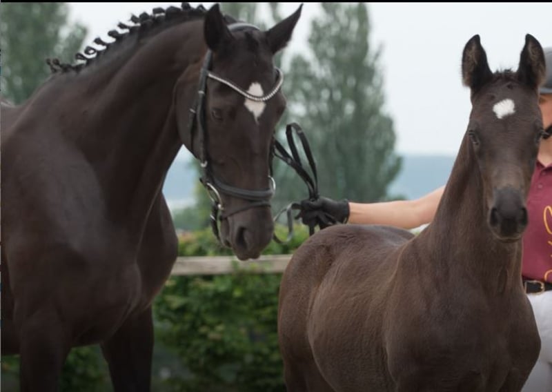 Escanero Del Solei is een zeer mensgericht, prachtig veulentje in een donkere coat, geboren in mei 2025. Bij nieuwe situaties toont hij veel interesse en is hij absoluut niet schrikachtig. Ook tijdens het oefenen van de veulentjes-ABC is hij snel leergierig en doet hij graag mee. Hij is halster- en trailer-veilig, en het afspuiten met water en het geven van hooi gaat uitstekend. Hij is gewend aan kinderen, auto's, tractoren en honden. Zijn pedigree is een uitstekende dressuurmenging van internationaal succesvolle voorouders. Zijn grootvader moer is de bekende Danciano, zelf winnaar op het Grand Prix-niveau, uit de lijn van Escanto PS Old, met de titel van Bundeschampion van de vierjarigen in zijn bloedlijn. Zijn vader, Escanto PS Old, 169 cm hoog, heeft een veelbelovend pedigree met Escamillo en Fürstenball in de bloedlijn. De jury gaf een 10 voor de "zeer, zeer expressieve draf met goede losgelatenheid, duidelijk lichtvoetig, met een absoluut positieve basisspanning en volledig in balans, ook in alle bochten". Ook voor de galop en de rijbaarheid werd een 10 toegekend. Hij is tweemaal winnaar van de Hengstencompetitie met de hoogste prestatiepunten. Deze hengst, geboren in 2019, heeft als vader de bekende Escamillo, die al zilver en brons won op het WK voor dressuurpaarden. Escanero’s oplettende, nieuwsgierige ogen weerspiegelen een hoge intelligentie. Zijn hals is mooi lang met een elegant gebogen halslijn. Door zijn grote, schuine schouder heeft Escanero Del Solei al nu ruime bewegingen, die op de veulentjeshow met 8,5 werden beoordeeld. Zijn galop is expressief, met een opwaartse tendens en krachtig vanuit de achterhand, wat hij duidelijk laat zien tijdens het spelen op de wei. Zijn draf zweeft taktrijp over de grond, net als zijn vader. Zijn hoge met de lange rug overgaande manenkam wijst erop dat het paard zijn ruiter en zadel goed kan dragen. De lichaamsbouw van Escanero Del Solei werd met een elegant fundament beoordeeld met 8 punten. Zijn ruime galop werd op slechts 6 weken leeftijd beoordeeld met 8,5. Zijn algehele indruk qua gedrag en toekomstige perspectieven kreeg een 9 van 10. Zijn type werd eveneens met een zeer goede 9,0 genoteerd. In totaal behaalde hij op de veulentjeshow van 16 juni een zeer goede score van 43,0 punten als premieveulen. Hij groeit momenteel samen met een ander veulentje in een kudde. Hij wordt niet eerder dan vanaf 6 maanden verkocht. Graag kan hij in München worden bezichtigd. We kijken uit naar een persoonlijke bericht.