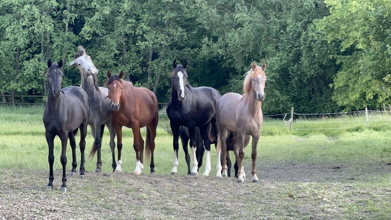 Lord Frechdachs AB is an exceptionally well-behaved, double-talented, and very resilient young horse. His sire is our homebred Holsteiner premium stallion and HLP winner, Lord Fernando AB, who impresses with outstanding rideability and strong aptitude for both dressage and jumping. His grandsire, Lamborghini Boy, was also double-talented (show jumping S, dressage). Like all his offspring, he is a characterful and trustworthy horse. Escarda, the dam of Lord Fernando AB, was successful up to S level in show jumping. The dam of Lord Frechdachs AB, Diabola, a De Niro daughter, has two full brothers who competed successfully up to S level and international competitions. His full brother, Lord of Life AB, was recently backed here at the stud and convinced his owners completely as a very rideable, social, performance-oriented, double-talented, and always fun leisure horse for the whole family. Lord Frechdachs AB is raised appropriately in a herd with older, experienced companions and seven other geldings of various ages. Thanks to the Bavarian low mountain landscape, with diverse terrain and a 24/7 summer pasture that also serves as a food source, all our horses have the best conditions for healthy growth. Naturally, all of them have mastered the foal basics and have already been transported in the trailer to the pasture. They all handled this excellently.