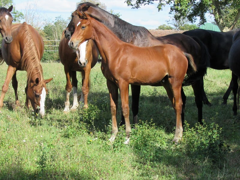 Nous vendons un poulain hongre de grande taille et robuste, issu de l'étalon Holsteiner Chinchero (de la station d'étalons Völz). Il possède une belle galopade en montée, ce qui laisse présager un grand confort d'équitation futur. Le pas et le trot sont également d'une très bonne qualité de base. Il est déjà très grand et costaud, de sorte qu'on peut s'attendre à ce qu'il atteigne au moins 170 cm et qu'il puisse accueillir des cavaliers plus grands sans problème. Sa mère est une jument de reproduction tout au long de sa vie et a toujours produit des poulains primés. Elle est elle-même inscrite comme jument primée de l'association et se distingue par un extérieur marqué par le sang. Par conséquent, on peut également attendre une aptitude pour le sport équestre de concours complet. Un élevage est possible. Une rencontre est également possible à tout moment sur rendez-vous préalable. Nous avons également une demi-sœur de deux ans, issue de l'étalon Holsteiner Esmeraldo, que nous avons actuellement à vendre. Si vous êtes intéressé, je peux vous fournir plus d'informations.
