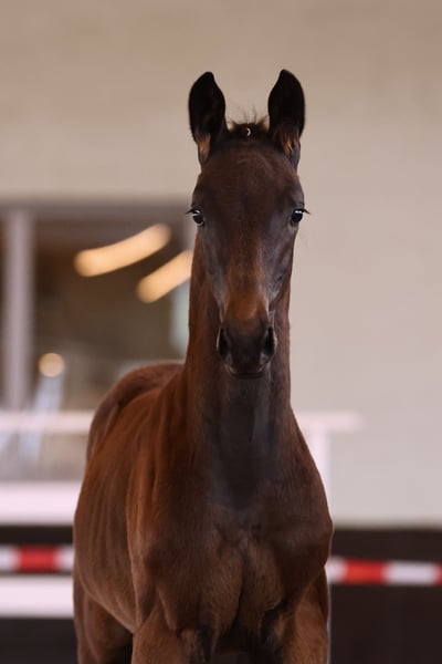Dressage colt foal Lindgren x Borsalino x Zonik x Diamond Hit Typical, dark brown colt foal by Lindgren (LeFormidable x Ampere) out of Batida by Borsalino x Zonik x Diamond Hit, born on April 18, 2025, is looking for a lovely new home from the end of October. The mother of Batida is a full sibling to Zonik Hit, who is successfully competing in Grand Prix sport under Lisa Müller. Lorenzo received a score of 8.5 for type, an 8 for conformation, and a 9 for movement at the foal show, making him a premium foal and qualified for the DSP Foal Championship. All three basic gaits are of good to very good quality, and he is also correct and very people-oriented.