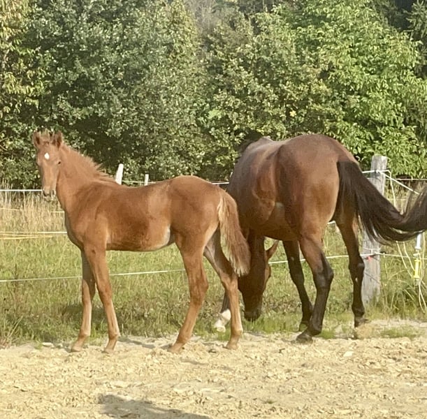 Pocket Rocket ist ein schickes und sehr korrektes Hengstfohlen mit herausragender Abstammung, die großes Potenzial im Springsport bietet. Vater Poker de Mariposa überzeugt international in der schweren Klasse und mit hervorragender Vererbungsleistung. Die Mutter, Hauptprämienstute Ce la Vie, stammt von Carrico von Catoki und mütterlicherseits von Arpeggio ab und hat uns schon einige herausragende Fohlen geschenkt. Pocket Rocket hat sich im Sommer für das Finale des deutschen Fohlenchampionats qualifiziert und den zwölften Platz belegt. Seine Vollschwester aus dem letzten Jahr befindet sich in unserem Besitz und kann gerne vorgestellt werden. Pocket Rocket beherrscht das Fohlen ABC und wurde regelmäßig entwurmt und dem Hufschmied vorgestellt. Insgesamt steht hier ein tolles Fohlen zum Verkauf, das sowohl für den Sport als auch für die Zucht großartige Veranlagungen mitbringt. Erwartetes Endmaß ist ca. 1,73m. Geboren am 3.6.2025, abzugeben ab Mitte November bis Anfang Dezember. Eine Besichtigung ist gerne möglich und erwünscht, Videos können vorab gerne von uns gesendet werden. Privatverkauf ohne Mehrwertsteuer.