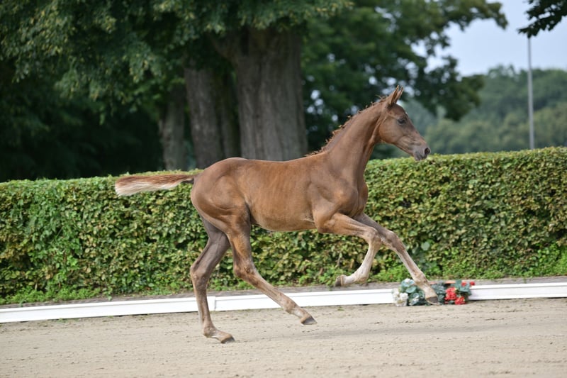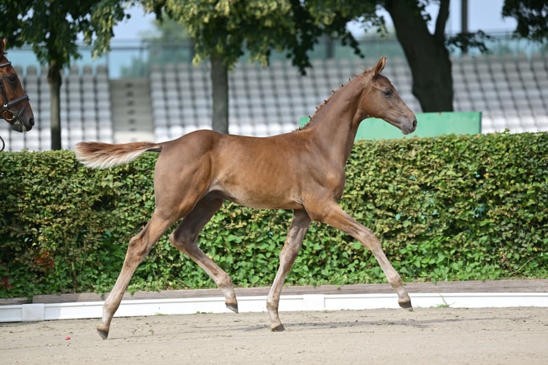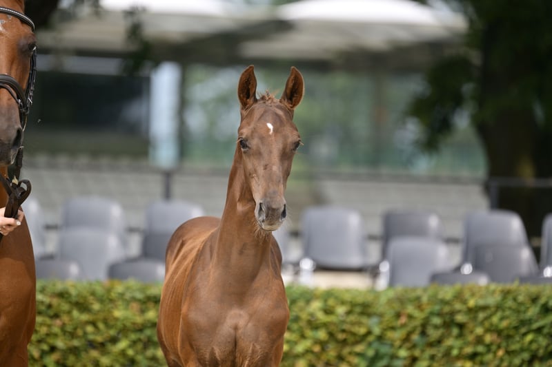 Dunkelfuchs, extrem typvolles Championatsfohlen, von Baloubino B x Acordelli Baloubino B (Holst. Stamm 776) war ein vielversprechender Junghengst, der bereits zum Anfang seiner Karriere im Springsport auf sich aufmerksam machte. Talent, Rittigkeit und seine Leistungsbereitschaft zeichneten ihn aus, und er wurde unter seinem Reiter Sandor Szasz bis 1,40 m erfolgreich vorgestellt. 2005 bestand er als zweitbester seinen 70 Tage-Test mit der Gesamtnote 8.6. Leider verstarb Baloubino B 2008 bereits im Alter von 7 Jahren. Von seinen bisher nur etwa 50 Nachkommen sind bereits >20% erfolgreich in den schweren und mittelschweren Klassen unterwegs. Hervorzuheben sind Nachkommen wie Samira 368 über 1,60 m und Bandolino 6 über 1,55 m erfolgreich. Sein Vater Baloubet du Rouet bedarf keiner Vorstellung. Mehr unter: https://aviator-horses.com/fohlen