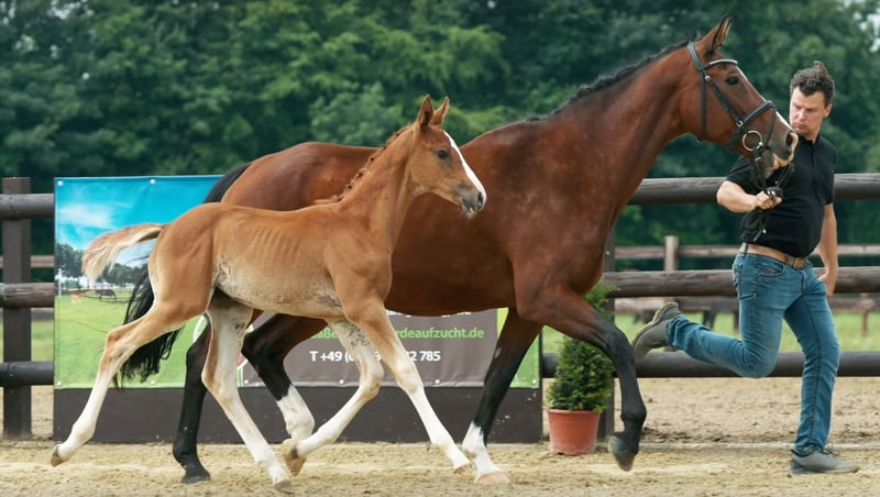 Yegua castaña Damaschina del semental premium y campeón de Bundeschampion Damaschino hija de Donnergirl.by DonquestadorxJaquarexRubinstein Nacida el 11.05.2021. Prerrequisitos. Stm. 172. Damaschina ya se puede domar. Tiene una conformación correcta y aires básicos por encima de la media. Hay que destacar su muy buen paso, heredado de su padre Damaschino por Danone (Donnerhall-Weltmeyer) - Fidertanz Caprimond. Damaschino fue Bundescampeón de sementales de 3 años en 2019, Vice Bundescampeón de sementales de 4 años en 2020 con una puntuación final de 9,4. Destacada cosecha de primeros potros con un precio máximo de 70.000 euros y un precio medio de 19500 euros. En 2021 Damaschino obtuvo el 6º puesto en la final del Campeonato del Mundo. La madre Donnergirl superó una buena prueba de rendimiento de yeguas. Los hijos de Donnergirl son todos aptos para el deporte. Su nieto Bombay Royal fue aprobado para el Bundeschampionat a la edad de 4 años. Por lo tanto, Damaschina reúne todos los requisitos para la gran pista y también es muy interesante por su pedigrí.