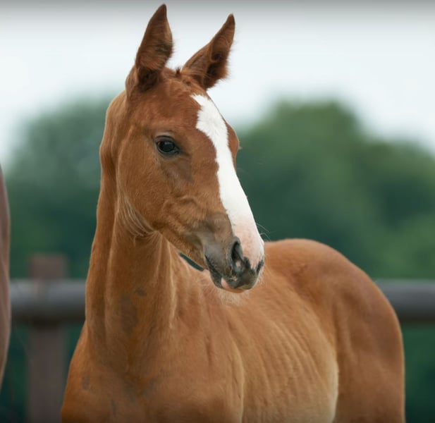 Chestnut mare Damaschina by the premium stallion and Bundeschampion Damaschino out of Donnergirl.by DonquestadorxJaquarexRubinstein Born 11.05.2021. Prerequisites. Stm. 172. Damaschina can now be broken in. She has a correct conformation and above-average basic gaits. Her very good ground covering walk, which she inherited from her sire Damaschino by Danone (Donnerhall-Weltmeyer) - Fidertanz Caprimond, should be emphasized. Damaschino was Bundeschampion of 3-year-old stallions in 2019, Vice Bundeschampion of 4-year-old stallions in 2020 with a final score of 9.4. Outstanding first foal crop with a top price of 70,000 euros and an average price of 19500 euros. In 2021 Damaschino took 6th place in the final of the World Championships. Dam Donnergirl has passed a good mare performance test. Donnergirl's offspring are all age-appropriate in sport. Her grandson Bombay Royal was approved for the Bundeschampionat at the age of 4. Damaschina therefore has all the prerequisites for the big arena and her pedigree is also very interesting for breeding.
