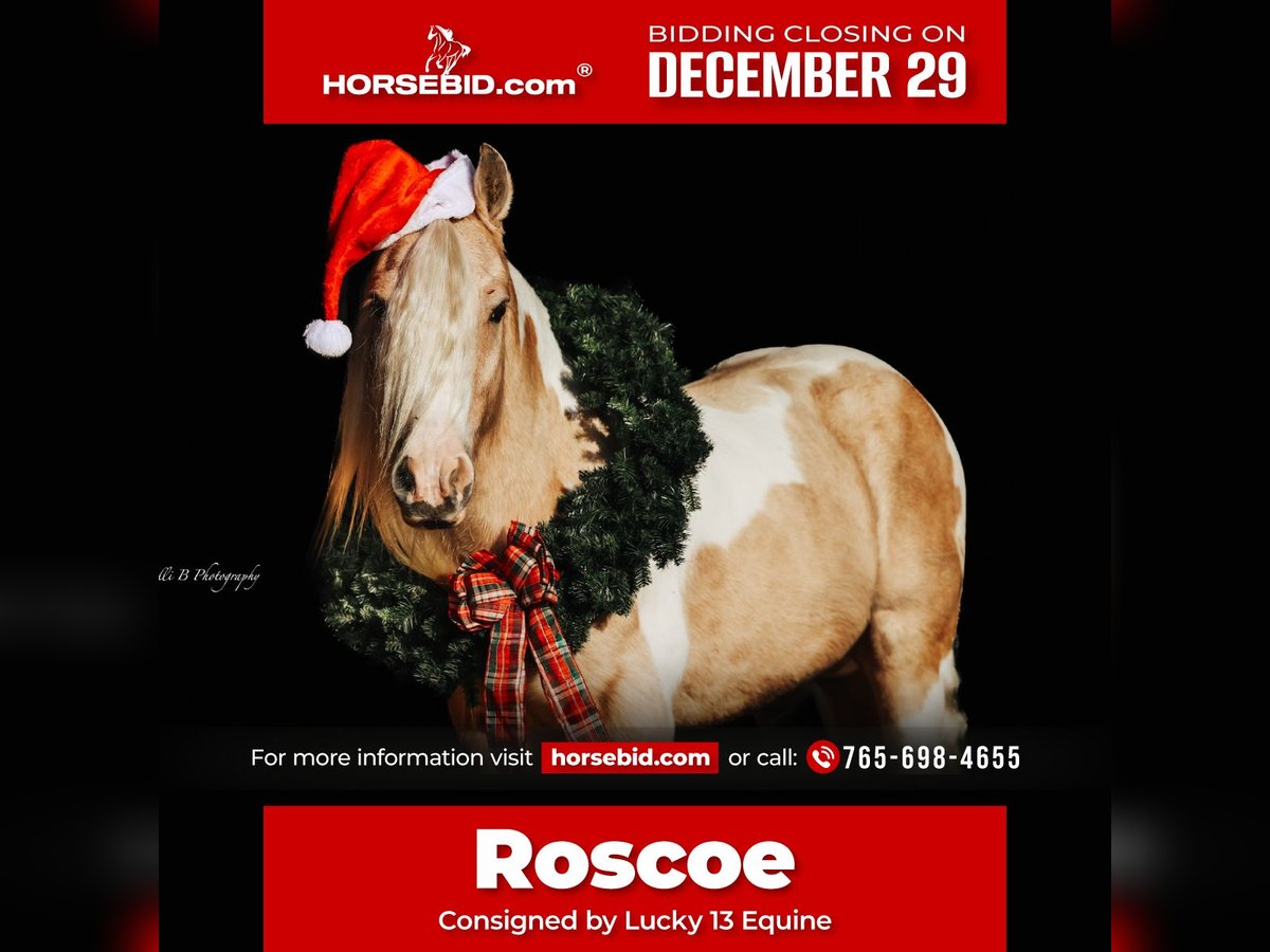 ⚜️ 𝓗𝓮𝓻𝓲𝓽𝓪𝓰𝓮 𝐖𝐢𝐧𝐭𝐞𝐫 𝓒𝓵𝓪𝓼𝓼𝓲𝓬⚜️ Happening now thru MONDAY | DECEMBER 29th - Available EXCLUSIVELY on HorseBid's website! For more details and to register visit: www.Horsebid.com CONSIGNOR CONTACT: Lucky 13 Equine 765-698-4655 LOCATION: Mount Vernon, KY BREED: Gypsy Vanner REGISTERED: No REGISTERED NAME: Roscoe COLOR: Palomino and white paint HEIGHT: 14.3 AGE: 9 GENDER: Gelding Meet Roscoe, a breathtaking 9-year-old Gypsy Vanner gelding standing 14.3 hands tall. His gorgeous palomino-and-white coat and classic Gypsy build make him an instant standout, but it’s his mind, training, and versatility that truly set him apart. Roscoe is an absolute gentleman on the trails steady, confident, and sure-footed across all kinds of terrain. Whether you’re out for a quiet evening ride or exploring new country, he stays relaxed and dependable. He’s also been to town and through busy environments, taking traffic, crowds, and commotion in stride. In the arena, Roscoe shows off his training. He takes both leads, stops, backs, turns around, side passes, and stays soft in the bridle. He has also been used extensively at exotic animal sales, moving every type of animal you can imagine. Working gates in that environment has made him extremely handy, responsive, and adaptable. Roscoe truly offers the best of all worlds beauty, brains, and a big, willing heart. He’s versatile enough for trail riding, pleasure riding, English, dressage, jumping, or driving, and kind enough for riders who want a trustworthy partner with a little extra style. If you’re looking for a stunning, well-trained, and dependable gelding that can fit into almost any lifestyle, Roscoe is your horse. Opportunities to own one like him don’t come around often!