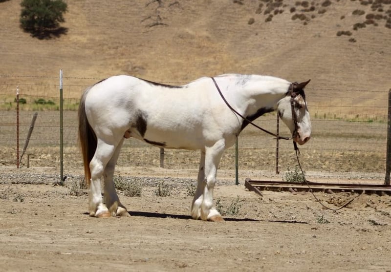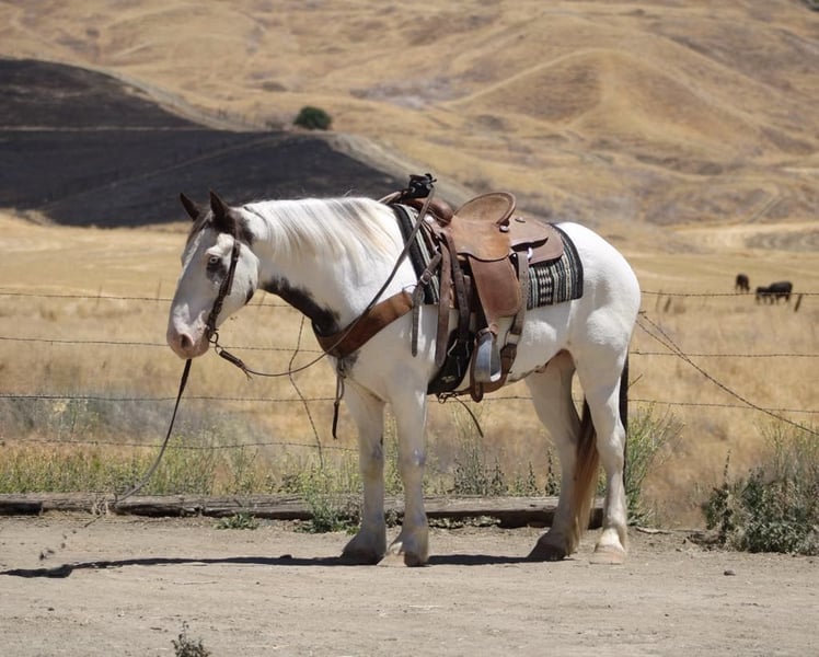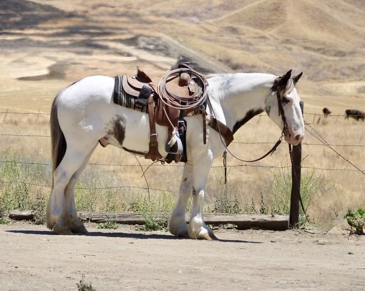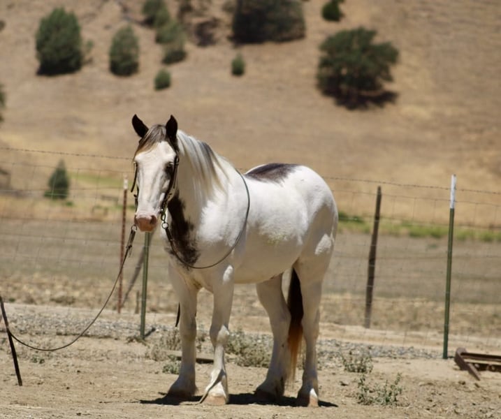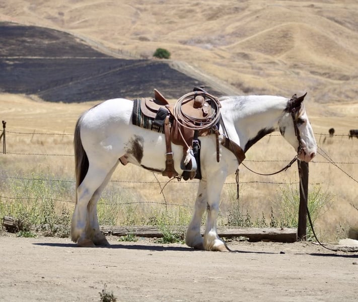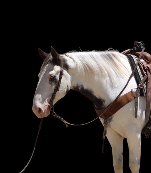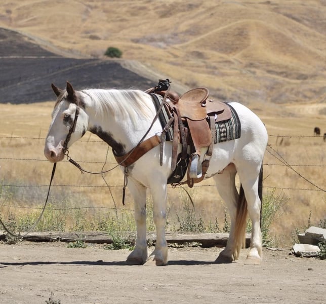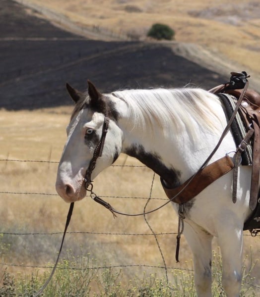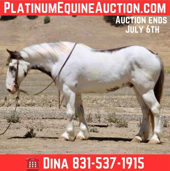 ONLINE AUCTION Place your bids at www.PlatinumEquineAuction.com Starting Bid $3500 Auction ends July 6 2025 Need a new saddle? Check out White Rock Saddles on our website or Facebook! Are you looking for a horse that will turn heads everywhere you go? Meet Finnigan, the cutest paint Gypsy in town. With his roan coat and striking one blue and one brown eye, this 10-year-old stands at a sturdy 14.1 hands and is ready to be your new adventure partner. Finnigan has been a delight to work with, displaying eager-to-please disposition. He excels in the arena, confidently picking up leads, transitioning between gaits, and starting to neck rein with ease. His stop is smooth and he is even starting to turn around and back up effortlessly. But his true passion lies in trail riding – he has been on numerous excursions and has proven to be a reliable and sure-footed companion. From navigating different terrains to crossing water and encountering wildlife, Finnigan takes it all in stride. Aside from his impressive trail skills, Finnigan also excels in obstacle work. He fearlessly walks over tarps, bridges, and even covered wagons. He has been exposed to a variety of new experiences and has handled them all with patience and a willing attitude. He has even been trained to carry flags and tarps, making him an adaptable partner. He has also been ridden in towns and is comfortable around cars and traffic. He ties clips and hauls great no shoes required for his nice strong hooves. Finnigan has been in pasture and stall environments. But perhaps what sets Finnigan apart is his lovable demeanor. He would make a great main trail partner and would also look stunning in English tack. Finnigan has the potential to do it all! He’s friendly, eager to please, and safe. Plus, he loves cookies and bath time! Come meet this mystical boy and see if he’s the perfect partner for your next adventure! Contact Dina at Longhorn Ranch 831-537-1915 in Paicines, CA. Your chariot awaits! ONLINE AUCTION Place your bids at www.PlatinumEquineAuction.com Starting Bid $3500 Auction ends July 6 2025 Need a new saddle? Check out White Rock Saddles on our website or Facebook!
