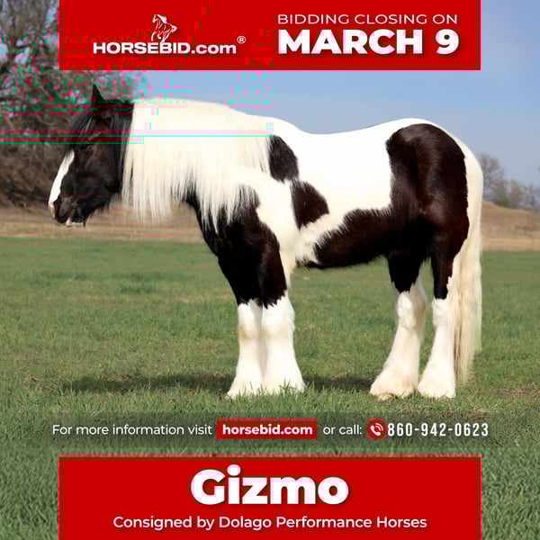 ℳ𝒶𝓇𝒸𝒽 ♦️𝐑𝐈𝐃𝐄𝐑'𝐒 𝐂𝐇𝐎𝐈𝐂𝐄♦️ Happening now thru MONDAY | MARCH 9th - Available EXCLUSIVELY on HorseBid's website! For more details and to register visit: www.Horsebid.com CONSIGNOR CONTACT: Dolago Performance Horses 860-942-0623 LOCATION: Ripley, OK BREED: Gypsy Vanner REGISTERED: No REGISTERED NAME: Gizmo COLOR: Gypsy Vanner HEIGHT: 14.2 AGE: 4 GENDER: Gelding Meet an exceptionally sweet and gentle 3 year old Gypsy Vanner gelding with a personality that is truly hard to find especially in one this young. With his kind eye, beautiful build, and signature Gypsy presence, he turns heads everywhere he goes, but it’s his loving personality wthat really makes him special. This gelding is the most gentle and solid 3 yr old i’ve ever handled. He truly behaves well beyond his years and genuinely enjoys being around people. If he could he would sit with you all day long and get loved on. He will lay down and sit on cue which shows how gentle and smart this 3yr old is. No matter what you’re doing with him, he’s the definition of kind and patient. Safe, sweet, and eager to please, he’s the type of horse that you’ll want to keep for the rest of his life. With his gentle disposition and strong foundation at only 3 , he has all the makings of an outstanding family horse, show prospect, ranch horse, anything really. He has no buck or rear and no spook. He dosnt bat an eye at anything we know that because we’ve done just about anything with him. He’ll walk through water, logs, trail courses, town, bikes, dogs, and none of that will make this horse think twice. He is one hand broke with a great stop and turnaround. He was also used as a lesson horse with kids all over him! You’ll have the same horse all tacked up or bridle less and bareback! He does great in any condition, in any tack, or anywhere! He is not just looks but he’s got ride too! The cherry on top of this horse is he is the most loving horse you’ll ever meet.