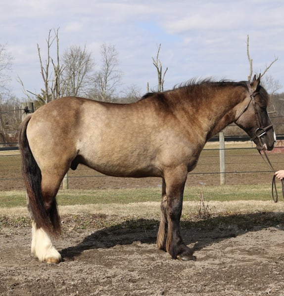 4 YO Grulla Gypsy Vanner x Shire Gelding. Recon stands at 15.3 with a stocky build. He is sound with no known injuries or maintenance and up to date on everything. He doesn’t crib, bite, kick, or weave.
