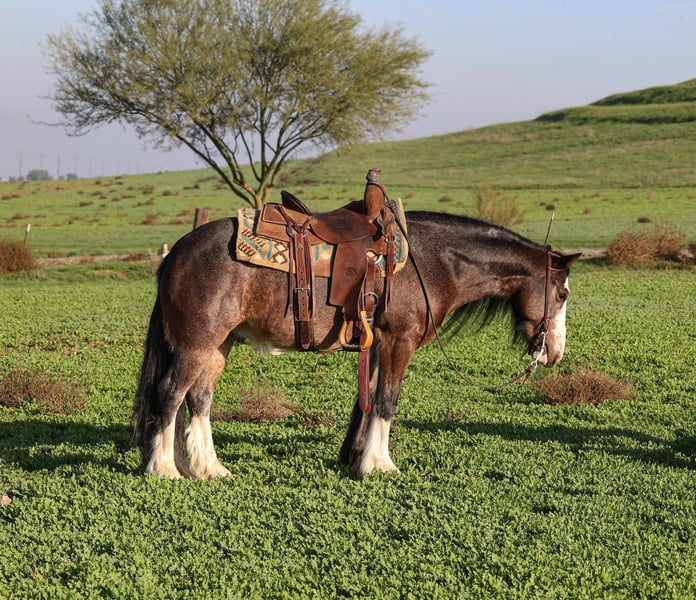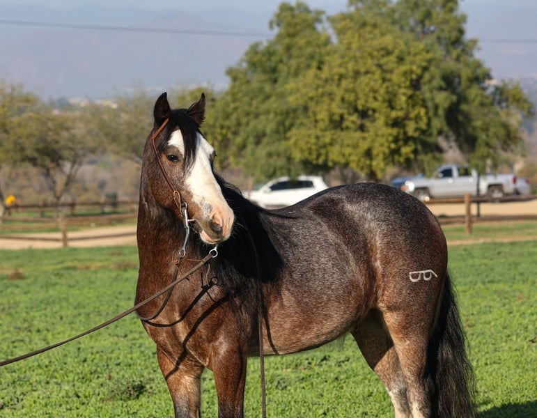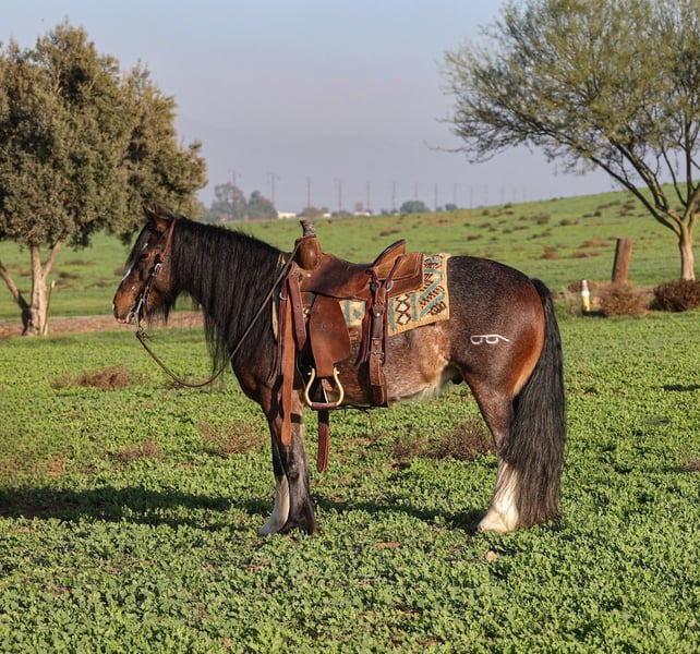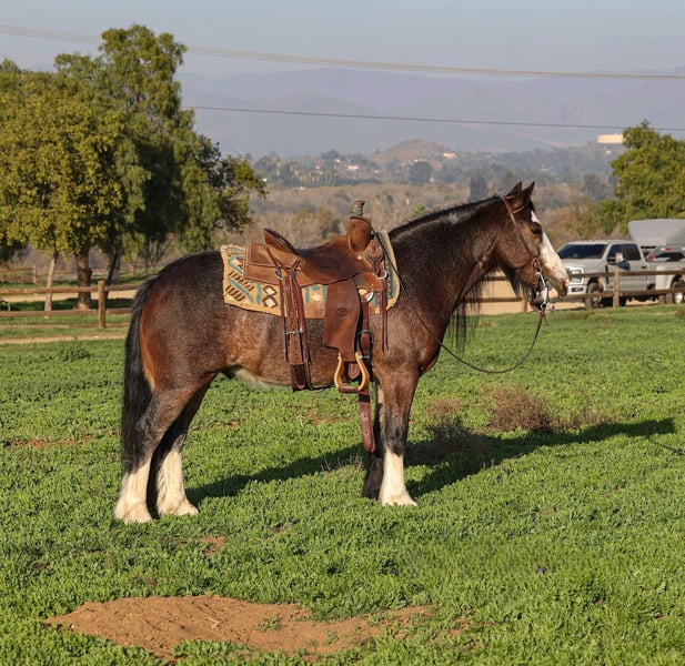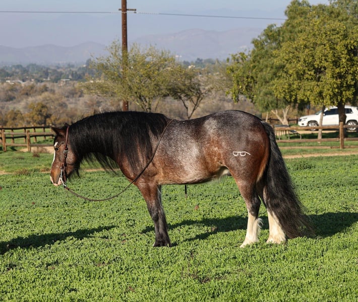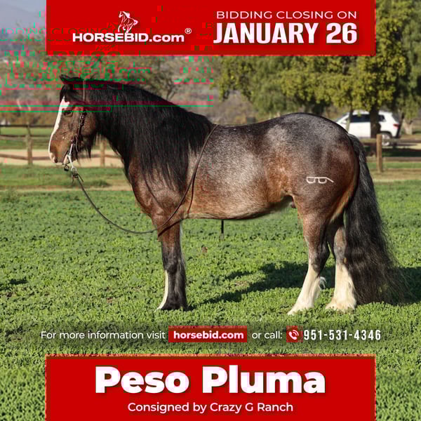 𝐉𝐀𝐍𝐔𝐀𝐑𝐘 ⭐️𝑨𝒍𝒍 𝑺𝒕𝒂𝒓 𝑳𝒊𝒏𝒆𝒖𝒑⭐️ Happening now thru MONDAY | JANUARY 26th - Available EXCLUSIVELY on HorseBid's website! For more details and to register visit: www.Horsebid.com CONSIGNOR CONTACT: Crazy G Ranch 951-531-4346 LOCATION: Norco, CA BREED: Gypsy Vanner / quarter pony cross REGISTERED: No REGISTERED NAME: Peso Pluma COLOR: Bay roan HEIGHT: 13.1 AGE: 6 GENDER: Gelding Outstanding All-Around Pony – Gypsy Vanner x Quarter Pony Gelding Meet Pluma, a handsome Gypsy Vanner x Quarter Pony cross gelding with the looks, brains, and versatility everyone is searching for. Pluma is truly an outstanding all-around pony who has experience in jumping, trail riding, gymkhana events, and obstacle trail courses. Pluma is quiet, willing, and dependable, making him suitable for riders of all levels. He is forgiving and kind, with a great work ethic and an easygoing attitude both in and out of the arena. On the trail, he is confident and steady; in the arena, he’s responsive and fun to ride. With his solid foundation, versatility, and gentle nature, Pluma would make an excellent first pony, while still being enjoyable for more experienced riders looking for a safe, reliable partner. Pluma has done a season of jr rodeo and excelled at it! From heeling, goat tying to running barrels! Pluma is not only a solid riding mount but he also has a few tricks under his sleeve! Pluma is trained to bow, lay down, and sit like a dog! If you’re looking for a pony that can do a little bit of everything and do it well, Pluma is the one. Pluma comes 100% sound and healthy, no colic, or lameness issues!