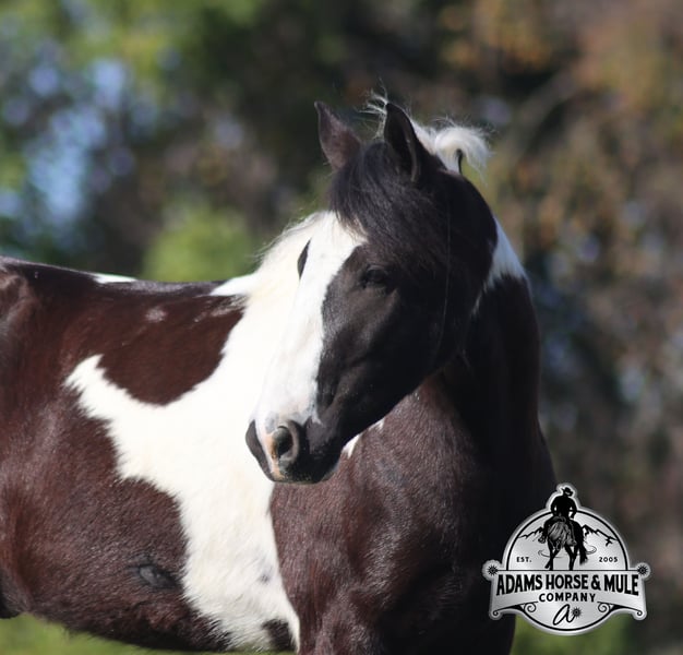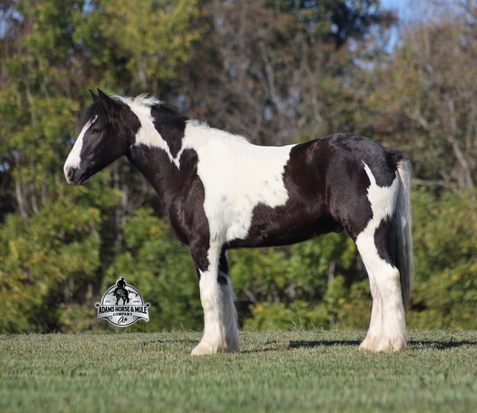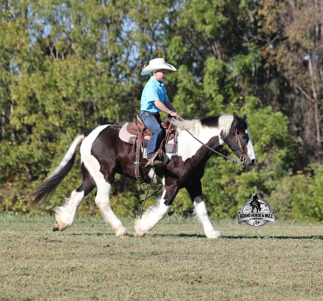 Go to visit our website for more pics and a video www.AdamsHorseAndMuleCo.com AHAMC has been in the horse business and sold horses over the internet since 2005. We have a long track record of success with hundreds of happy customers. We work hard to match riders with the correct horses and specialize in beginner safe, family friendly horses that have been used and checked out by our family! We can set up transportation anywhere in the US and look forward to working with you. Lakota is standing around 14h, he is 5 years old, a Gypsy Vanner Cross, Gelding and if you are looking for a horse that will bring countless smiles, miles of memories and nothing but good times in the saddle… then meet Lakota. He has been our 7-year-old boys favorite ride all summer long, and he has been tested over and over again, passing with flying colors every time! This guy loves attention and likes to be pampered! From braids to baths, he loves his time with his kids! He is gentle enough for the kids to ride but stout enough to comfortably carry a smaller adult. Lakota is a phenomenal trail horse and goes anywhere that he is asked. He has been ridden up/down steep slopes, across creeks, ditches, deadfall, rough rocky areas… you name it, and he can handle it. He rides with confidence, will go out alone, will ride in the front or back of the group and leaves the barn with no issues. He is traffic safe and has been ridden through town. He lopes nice circles, takes the correct leads, has a good stop and is easy to operate. In addition to riding western Lakota has been ridden English and has been over jumps. He has been ridden around the ranch and through the cows. Lakota is a great horse for the whole family to love and enjoy for years to come! For more info call Eric 606-308-2461.