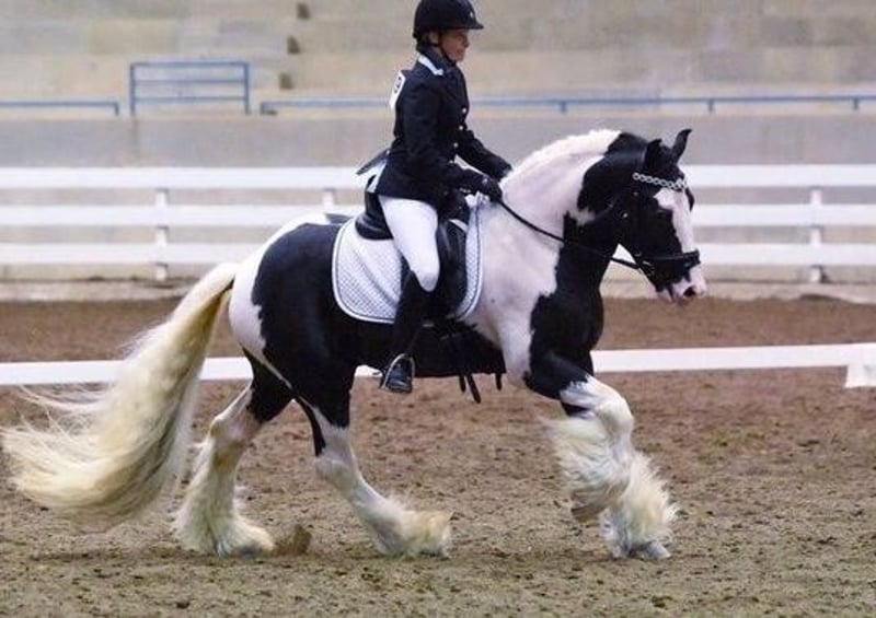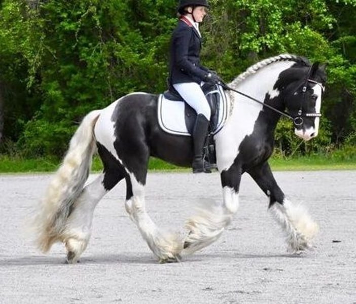 purebred Gypsy Vanner stallion with both beauty and brains. He is sired by Blue Mountain Tiger — a 10-time U.S. National Gypsy Champion — and out of Olde Horse of Wales Last Charm. Carrying on that legacy, Seneca himself is a two-time National Champion. Highlights: Breed: Purebred Gypsy Vanner Color: Black & White Heterozygous Tobiano Height: 16.1 hands Training: Western & English Dressage (trained by Scott and Ashley Sarkozi) Accomplishments: 2 National Titles + numerous class wins Conformation: Straight legs, short back, solid feet, excellent proportions Feathering: Exceptionally heavy mane, tail, and feather Seneca is everything you dream of in a Gypsy stallion: commanding presence, powerful movement, and that signature Gypsy head toss — all wrapped in a gentle, willing, and playful temperament. He’s reliable under saddle, affectionate on the ground, and loves to connect with people. Though a decorated champion, Seneca is not just about titles. He’s a versatile partner ready for his next chapter — whether continuing in the show ring, enjoying dressage and equitation, or simply being someone’s beloved daily riding horse and trail companion.