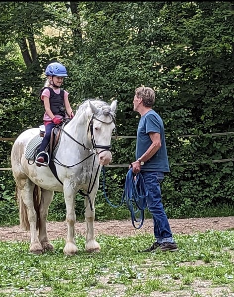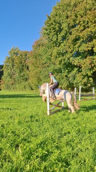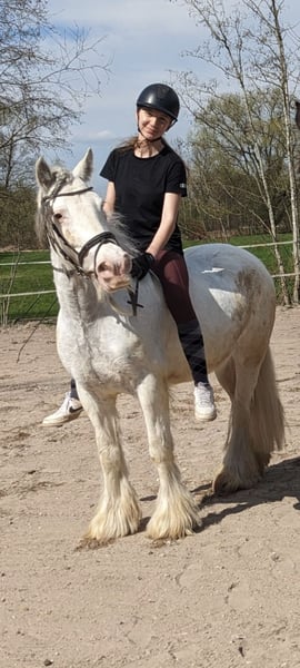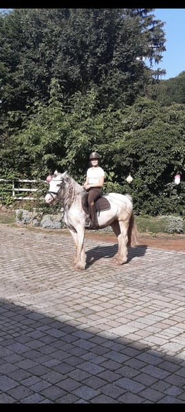 Suras ist ein 7 jähriger sehr umgänglicher, reingezogener Irish Cob Tinker Wallach. Stockmaß 140cm Er lässt sich von jedem Putzen und ist auch im Umgang mit kleinen Kindern sehr freundlich. Er macht auch beim freilaufen gut mit, ist sehr geelehrig und kennt auch ein paar Tricks. An der Longe läuft er lieb mit kleinsten Kindern in allen Gangarten und auch über Stangen oder kleine Sprünge. Mit einer 15 jährigen und einer 12 jährigen Reiterin springt er kleine Parcours, kennt basis Dressurarbeit und geht mit ins Gelände. Für schwächere Reiter und Anfänger ist das freie Reiten mit ihm eher schwierig, da er auch gerne mal testet und in eine andere Richtung läuft. Buckelt jedoch nicht o.ä. Suras braucht viel Beschäftigung und im Idealfall auch viel Freigang, da er anfängt zu Koppen, wenn ihm langweilig wird. Er ist artig beim Schmied und fährt problemlos im Anhänger. Der Preis ist selbstverständlich verhandelbar.
