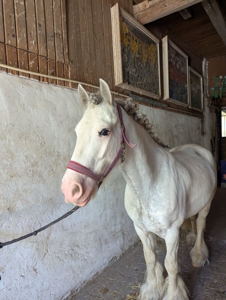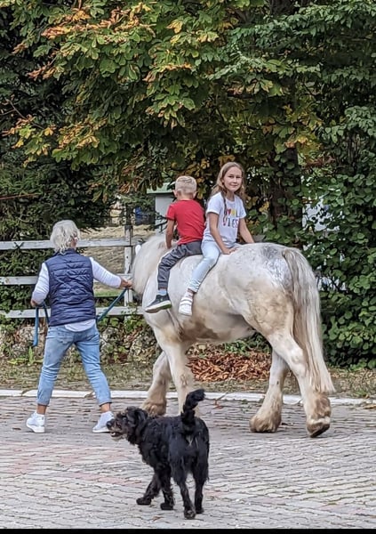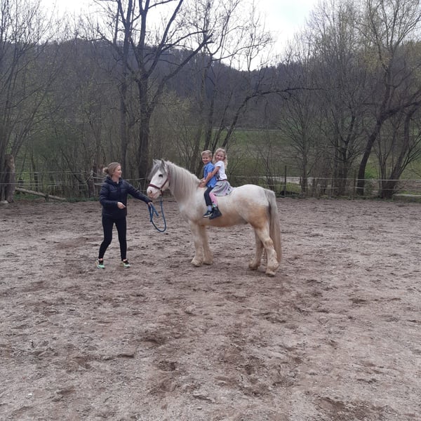 Suras is a 7-year-old, very friendly and well-mannered Irish Cob Tinker gelding. Height: 140 cm (approximately 14.1 hh). He is easy to groom and very gentle with small children. He also enjoys free movement and is very intelligent, knowing a few tricks. Lunging him is a pleasure, even with very young children, in all gaits, and he is comfortable over poles and small jumps. With a 15-year-old and a 12-year-old rider, he jumps small courses, is familiar with basic dressage work, and is suitable for trail riding. For less experienced riders and beginners, free riding with him can be challenging, as he sometimes tests boundaries and may go in a different direction. However, he does not buck or show other issues. Suras needs plenty of mental and physical activity, ideally with ample turnout, as he can develop cribbing if bored. He is well-behaved at the blacksmith and loads easily into the trailer. Price is, of course, negotiable.