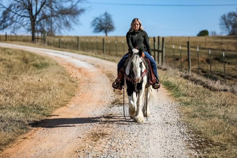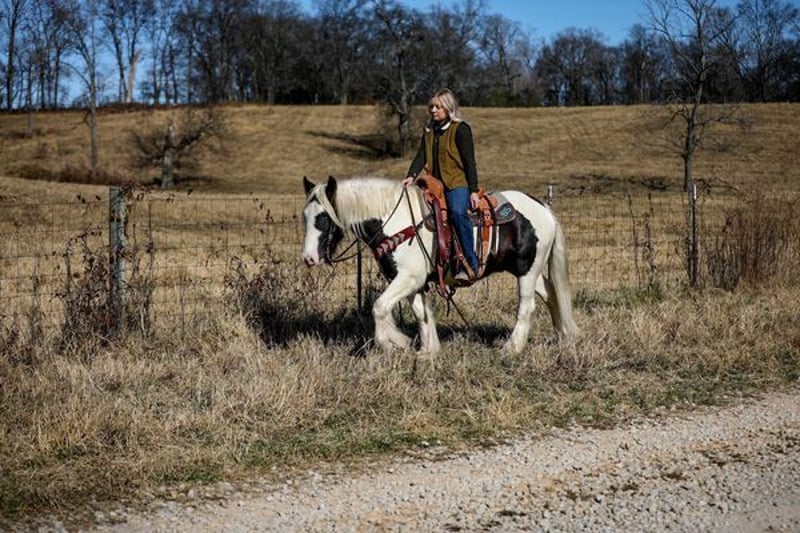 Are you looking for a young, athletic, big boned Gypsy Vanner with great structure and bone? If so, then Axel is your guy. He stands 14H tall and wide. He has all the potential in the world. He is so willing and eager to learn anything you throw his way. Axel has been ridden through just about every obstacle and atmosphere you could possibly imagine. From riding through bison, loading semis with cattle, rough trails, and even parades with all the loud music and floats, Axel takes it all with a grain of salt. Axel has been an “in your pocket” type horse since he was a weanling, wherever you’re at or whatever you’re doing, he wants to be right there with you. He is very low in the pecking order and would rather be right by your side than in the field playing with other horses. Axel is a very thick made gelding that has more whoa than go and would make an exceptional kid’s horse. He rides off your legs and seat so much that you can pull your bridle off and enjoy your day on his back with nothing on his head or neck. When it comes to loading and hauling Axel is a pro, no matter if you’re in a slant load trailer at a show or a stock trailer in the middle of the pasture, Axel will load himself into trailers amazingly. He is truly a stunning, young gelding with a heart full of kindness and a mindset the whole world should have. So, if you are looking for your next lifelong partner that loves attention, easy to be around, eager to please and just an all-around exceptional young gelding