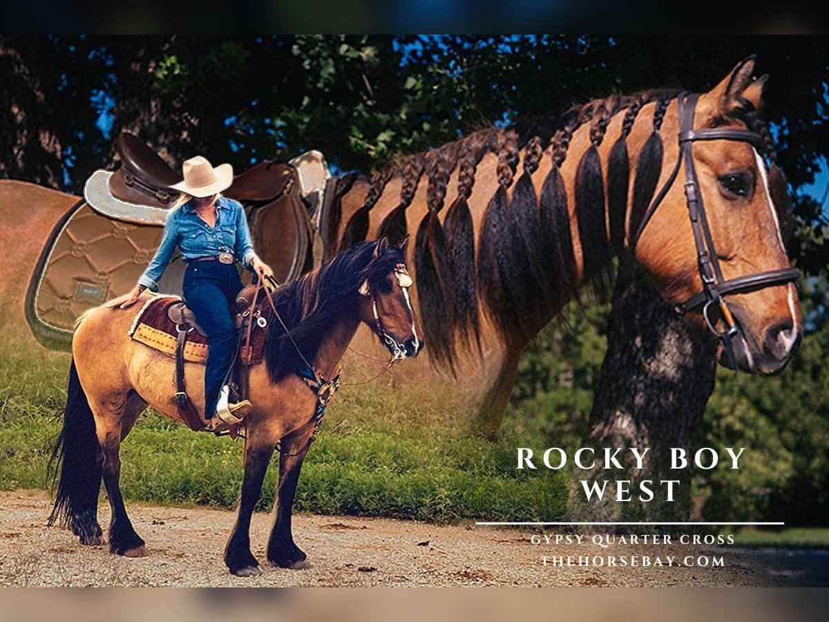 Rocky Boy West, or “Westy” as he’s known ‘round here, is a coming 7-year-old 14.3h Gypsy/QH X gelding. Not only is he easy on the eyes, with his unique dunskin coloring, wide, distinctive dorsal stripe, and all the mane and tail you could hope for, but he has the kindest, loving nature to match. He comes with just enough feather to look elegant, while remaining low maintenance and a soft, sweet eye. We are only Westy’s second home, and he has been a part of our herd for nearly a year – We have truly loved our time with this good, honest gelding. Westy was bred and raised in the hills of Montana. He knows the wind and the wild – he has been down the trails, crossed the water, and pushed the cattle. He spent a season learning a hard day’s work ranching in California, he’s been roped off of and is a handy horse with a willing spirit. Westy is broke to ride English and Western and has three comfortable gaits. He stands still to be mounted from the block or the ground. He can be ridden bareback in a halter, has a nice turnaround, and a great stop on him. He is soft in the bridle and responsive to leg cues – a really enjoyable ride. He has been lightly started over fences and took to it like a natural! On the trails, Westy is steady of mind and surefooted. Nothing seems to faze him, point him any direction, and he’ll head that way with ease. He appreciates nature and seems to feel most at home in the great wide open. He is a horse with a great heart – a solid, trustworthy partner. Westy is always a favorite of the farrier. He stands quietly to be groomed, bathed, and braided. He is an easy keeper, currently on a forage-only diet and is near the bottom of the pecking order – he is always the horse in the pasture that encourages the herd to run and frolic, and he is always kind to others. He is gentle on the ground, and he loads and unloads from the trailer like a seasoned traveler. Westy was sired by His Majesty the King’s Heir (GV00651F1) and is eligible for registration. He sells sound, clean, and UTD. PPE on file. Located in Jacksboro, TX. Tiny Pony Co. rider is 5’6 for reference. Text or call Courtney Maddux anytime with your questions or to schedule a visit! We love this horse, and we know you would too.