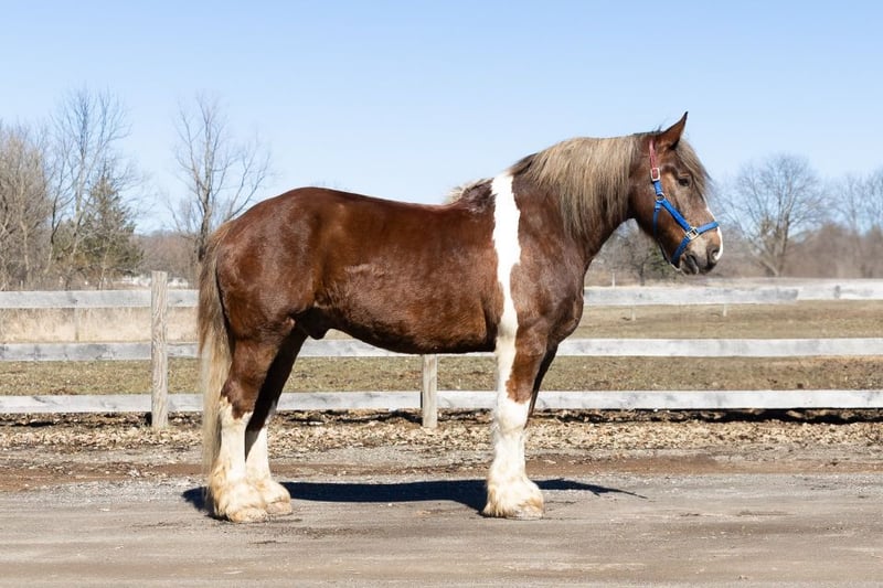 "AVAILABLE ON ONLINE HORSE AUCTION AT www DOT MagicHorseAuction DOT com BIDDING OPEN NOW thru TUESDAY | MARCH 31st! BUY IT NOW AVAILABLE! *Final price will be determined on auction site* CONSIGNOR CONTACT INFO: ELLESSEE SCHWARTZ #248-390-6831 LOCATION:Howell, MI" I'm proud to introduce Kingston. We have been holding on to this one for quite some time. He is the kind of horse that turns heads wherever he goes. This stunning boy is 7 years old, and stands a solid 16.3hh! He is a chesthnut and white in color with a silver mane and tail. Kingston is a spotted draft Gypsy Vanner cross gelding who is remarkable in every way. He has deep dapples when the sun shines on his coat. Nice feather on all 4 legs. A naturally wavey mane and tail that flow as beautifully as the ocean waves. On the ground Kingston's a perfect gentleman, he's as gentle as a lamb. Kingston is a powerhouse of strength, versatility, and athleticism. For a horse of his size, Kingston moves with incredible grace and fluidity, making him not only a reliable mount but also an athlete. You can ride him English, Western or even bareback and he will deliver an exceptional experience, seamlessly transitioning between disciplines. He knows all liberty work such as how to lay down, sit and even say yes and no. He may leave you wondering if he's a horse or a puppy dog! He is 100% a people loving horse who will greet you at the gate every day!! What truly makes Kingston stand out is his “been there, done that” attitude. He is the definition of a bombproof horse—absolutely safe in any environment. Kingston has been ridden on state roads, there’s not a truck too big to scare him! in the woods, open fields, and has even gone on a shopping trip to our local farm store! One glance into his big brown eyes will steal your heart. Out on the trails, Kingstons calm, and steady nature shines. Water crossings, tarps, bridges and other common obstacles do not phase him in the slightest. His even temperament makes him an ideal horse for beginners who need a forgiving partner, while his experience and smooth gaits make him just as enjoyable for advanced riders. We encourage you to watch the video as kids as young as 5 can handle and ride him. Kingston is the rare horse that adapts to his rider’s needs, making him a perfect fit for anyone from novice to seasoned equestrians, from small kids to savvy teens and timid adults he will take care of you! And speaking of smoothness, Kingstons three gaits are simply unbeatable. His walk, trot, and canter are incredibly fluid and comfortable, making him perfect for all-day rides without leaving you sore. Whether you are working in the arena or exploring the trails, Kingstons athleticism and stamina ensure he will keep going strong, mile after mile. In short, Kingston is the full package: strikingly beautiful, strong, athletic, and most importantly, safe. If you are looking for a versatile horse that excels in riding in a variety of disciplines from English to western, in the arena and on the trails Kingston is the perfect partner. He is ready to take on anything, whether you are a beginner looking for safety or an experienced rider seeking a smooth, dependable horse for long adventures. Kingston lives in Howell, MI 48855. Please call or text Ellesse Schwartz at 248-390-6831 for more information.