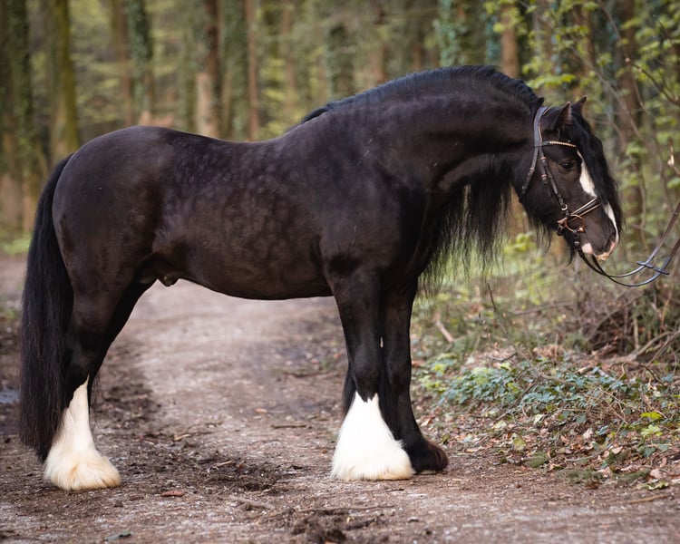 Pablo Picasso Malone – Tinker-Wallach der Extraklasse Pablo (*2018) vereint Ausdruck, Leistungsbereitschaft und Charakter auf bemerkenswerte Weise. In seiner seltenen Smokey-Black-Farbe, mit einem Stockmaß von ca. 1,45 m und einem korrekt aufgebauten, harmonischen Körper, präsentiert er sich als Pferd für Kenner und Liebhaber gehobener Qualität. Sein wacher, zugleich sanfter Ausdruck spiegelt ein Interieur wider, das durch Verlässlichkeit, Arbeitsfreude und Souveränität geprägt ist. Pablo ist gekört und absolvierte die gerittene Hengstleistungsprüfung mit der hervorragenden Endnote von 8,65! Seine Abstammung (IST Padraig Malone x Hermits Ghost Pipit) steht für nachweisbare Leistungsbereitschaft und züchterische Qualität – mehrfach ausgezeichnet und sowohl im täglichen Einsatz als auch vor dem Zuchtverband bewährt. Pablo wurde 2025 kastriert und war zuvor im Deckeinsatz. Seit seiner Geburt lebt er in einer Herde aus anderen Wallachen und Hengsten. Er wird nicht in absolute Einzelhaltung abgegeben. Im Kontakt mit Stuten ist er nicht hengstig, eine Haltung mit Stuten haben wir jedoch noch nicht probiert. Ausbildung und Einsatz: Pablo ist solide geritten und gefahren. Er zeigt sich sowohl im heimischen Umfeld als auch auswärts jederzeit souverän – ob auf Lehrgängen oder bei Veranstaltungen. Seine Ausbildung erfolgte stets mit Blick auf langfristige Gesunderhaltung und Motivation. Eingefahren wurde er professionell; aktuell wird er darin nicht weiter gefördert. Er eignet sich für ambitionierte Pferdemenschen, die ein fein ausgebildetes, vielseitiges Pferd zu schätzen wissen und entsprechend weiter fördern möchten. Ein reines „Anfängerpferd“ ist er bewusst nicht. Gesundheit: Pablo ist gesund, PSSM-negativ und wird engmaschig sowie gewissenhaft betreut (Impfungen, Wurmkuren, Hufbearbeitung, Zahnkontrollen, physiotherapeutische Begleitung). Wir wünschen uns für Pablo einen Platz, der seiner Qualität, seinem Charakter und seiner bisherigen Förderung gerecht wird. Anfragen bitten wir daher ausschließlich von ernsthaft Interessierten, die ein entsprechend wertschätzendes Umfeld bieten können. Ein persönliches Gespräch sowie ein Kennenlernen vor Ort setzen wir voraus.