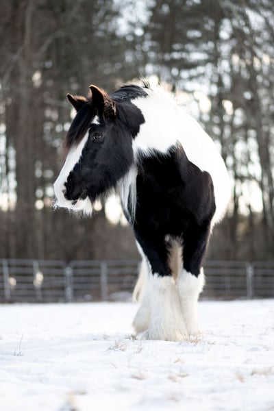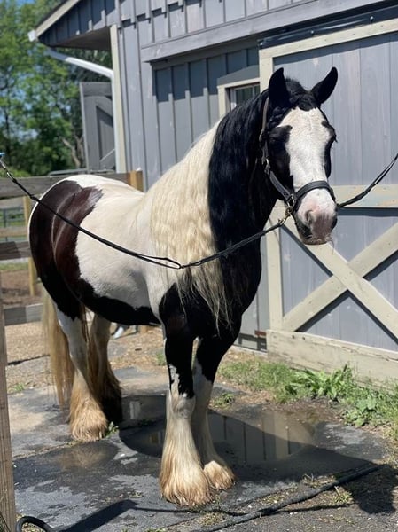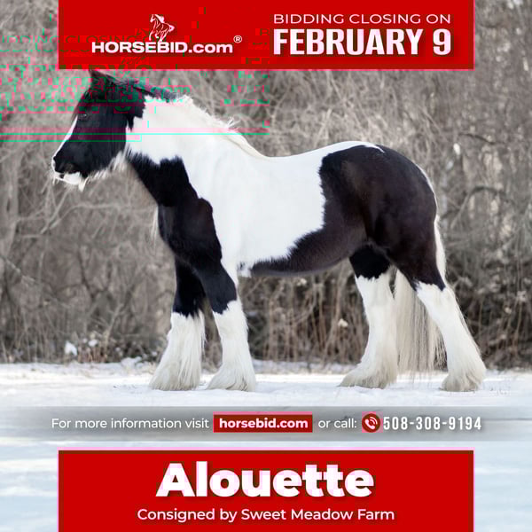 ❤️🔥𝑩𝒆 𝑴𝒊𝒏𝒆 𝐒𝐄𝐋𝐄𝐂𝐓❤️🔥 Happening now thru MONDAY | FEBRUARY 9th - Available EXCLUSIVELY on HorseBid's website! For more details and to register visit: www.Horsebid.com CONSIGNOR CONTACT: Sweet Meadow Farm 508-308-9194 LOCATION: Sherborn, MA BREED: Gypsy Vanner REGISTERED: Yes REGISTERED NAME: CR Alouette COLOR: Piebald HEIGHT: 14.2 AGE: 13 GENDER: Mare Alouette is a 13yo 14.2h triple registered, proven Gypsy Vanner broodmare. She sells with a pre-paid breeding contract to 6x National Champion and Hall of Fame Stallion Dakota Spirit Ori, 14 yr old 14’3hh, Buckskin Ee, Aa, nCr from May Day Acres for the Spring of 2026 season. She is registered with the Gypsy Horse Registry of America, Gypsy Vanner Horse Society and the Gypsy Horse Association. She is by GG Cardinale who is out of the famous Shampoo Girl and the most impressive The Gypsy King, and out of Lake Ridge Sophia who is by Lake Ridge British Sterling. Basically, she is bred impeccably, she has been genetic tested and is N/N all the way around This girl is stunning and passes down her sweet disposition to her foals. Her thick and luscious mane, tail, and feathers add to her overwhelming beauty. Her bone structure and balanced frame and one-of-a-kind structure make her stand out among the Gypsy Vanner mares. In the barn she loves to be pampered and stands all day for grooming and bathing. She loves treats and has the cutest mustache. In the ring she rides English, Western, Vaulting and Drives too! She rides with or without contact and has a good whoa. She is very willing to jump cross rails. She was used in our beginner lesson program, at first, she was great but then has decided that wasn't the job for her. Because of this she has been out of work for the last couple months. She would do much better with a one-person advanced rider. She rides out alone or with others, will lead or follow and doesn't mind traffic or dogs. She loves water and will cross bridges and logs too. She is as wide as she is tall, so she is a good weight carrier. This girl has been so very kind and gentle with the kids in the barn decorating her with ribbons and bows and painting her to look just like the princess she is. She never pins an ear or bats an eye. She is great in group turnout. Easy to load, haul and unload, great for clipping, bathing and the farrier. Here is a dream horse that everyone will fall in love with and will make the cutest babies!