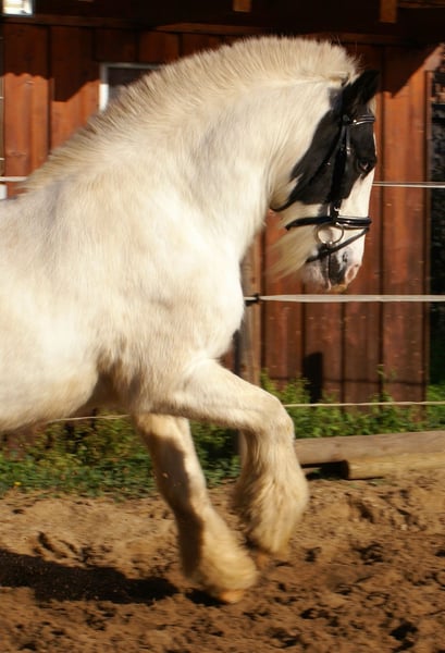 Tolle Rappscheck Tinkerstute, 15 Jahre, 147 cm, mit einem blauen Auge, artig im Umgang und beim Reiten, schön zu reiten, bewegliche sportliche Art, keine Rehe oder Mauke, kennt Hunde und Traktoren, nicht schreckhaft, schmiede- und verladefromm