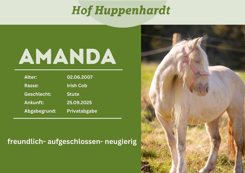 Wir suchen ein neues Zuhause für unsere Tinkerstute Amanda. Die am 02.06.2007 geborene Stute wurde von uns im Sommer 2025 aufgenommen, da die Besitzerin sich nicht mehr um sie kümmern konnte. Bei uns zeigt sie sich aufgeschlossen, neugierig und kontaktfreudig. Sie steht bei aktuell in einem großen Offenstall mit gemischter Herde und genießt die Weidezeit. Sie ist rangniedrig. Laut Vorbesitzer wurde Amanda früher geritten, viel im Gelände. Wir haben bis jetzt nur gemütliche Spaziergänge getestet, da sie eine sehr zierliche Stute ist! Amanda ist Menschen gegenüber aufgeschlossen, lässt sich überall berühren und fasst schnell Vertrauen. Am liebsten würde die kleine Stute in einen hineinkrabbeln und alle Aufmerksamkeit genießen. Leider kam sie mit starkem Kotwasser zu uns, welches wir immer besser in den Griff bekommen. Stressbedingt tritt es allerdings immer mal wieder auf. Wir wünschen uns für sie ein neues Zuhause mit eigenen Menschen, wo sie das Pferdeleben richtig kennenlernen kann. Wir sind ein Tierheim für Großtiere. Alle unsere Schützlinge werden nach positiver Vorkontrolle und gegen eine Schutzgebühr vermittelt. Gerne können die Tiere nach vorheriger Terminabsprache bei uns auf dem Hof besucht und kennengelernt werden.