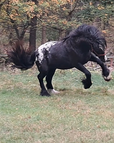 For sale: Tinker mare – Perfect for leisure riding! We are offering a beautiful Tinker mare, born in 2023. She impresses with her striking tobiano coat pattern (Smokey Black Appaloosa with tiger striped saddle blanket) and a friendly temperament. With a height of approximately 15.2 hands [still growing], she is ideally suited for recreational riding, shows, or breeding. The mare is healthy, well-socialized, and exhibits a very gentle nature in handling. Sold only with a final stable placement due to health reasons. This is not a distressed sale. Papers are from the ICS. Whether for long walks or simply to fall in love with – this young Tinker lady is a wonderful companion for anyone seeking a reliable and charming leisure horse. I have already led her around in walk with my daughter, and she remains calm. Otherwise, she is still quite raw, as she is still in her growth phase and needs time and care. Overall, she is very level-headed. Please feel free to contact me for further information or if you are interested!
