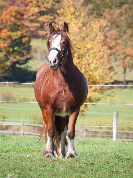 This beautiful bey filly looks just like her sire, and boasts a royal collection of grandparents in The Gypsy King, Vintage Vanner’s Tessa, Clononeen Poitin, Sid’s Good Stallion and The Rose. This fabulous filly carries some fantastic genetics on both sides. WHR Anisette is sweet, smart, has age appropriate training and is sure to turn heads wherever she goes. She stands tied, stands for the farrier, and loves to be groomed. Her sire is 14.2h, and her dam is 15.2. Based on her current size, we think Chrome will finish out around 15h. This quality Vanner filly is GVHS registered, and PSSM1 negative by parentage. She would be a great performance partner, or a important addition to your breeding program.