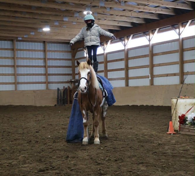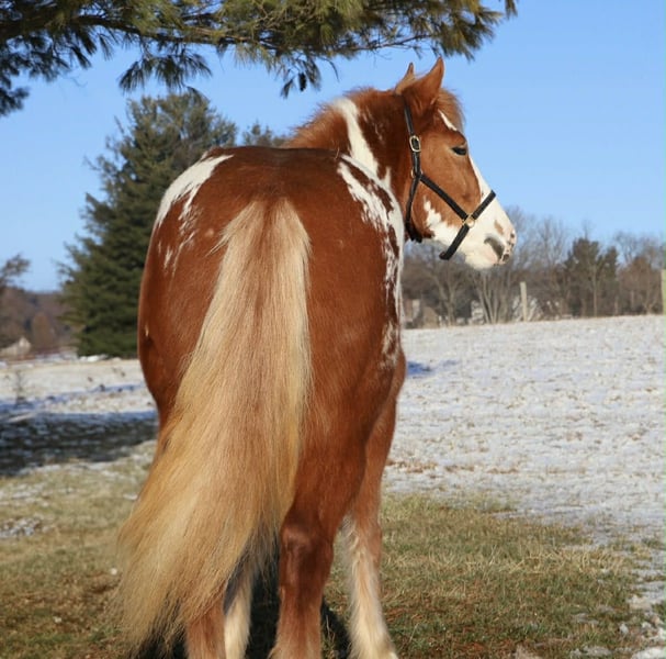 "AVAILABLE ON ONLINE HORSE AUCTION AT www DOT PlatinumEquineAuction DOT com BIDDING OPEN NOW thru SUNDAY | MARCH 1ST! *Final price will be determined on auction site* CONSIGNOR CONTACT INFO: Ellesse Schwartz 248-390-6831 LOCATION: Howell, MI Get ready for your perfect match! This sweetheart is hands down one of the most beautiful gypsy vanner Haflinger crosses you will meet. This little lady stands 14.1hh at 4 years old. She’s got a stunning chestnut and white overo coloring covering her coat. Light feathering on all 4 legs, the most stunning thick strawberry mane and tail. Her conformation is very classic and correct. Splash has a petite and pretty face with a kind and expressive eye. Splash is full of personality in a good way. She knows all the liberty work and will lay down on command! She's carried the flag, steeps over tarps, bridges and plays with the giant ball! She can say yes and no and side pass right over to the mounting block! This little lady is always happy to greet you and will stand for hours for grooming. She has had 60 days in harness and has driven across the countryside of Michigan. Under-saddle this girl is a blast!! She walk, trots, and canters with comfort and ease. She comes equipped with effortless transitions both upward and down. She stops on a dime and backs up like a pro. Splash moves very well off of seat and leg pressure as well. She has been working in the arena schooling 1st level dressage moves and works with ease and elegance. She’s a smart girl, once you teach her something she gets it’s and comes out the next day aiming to please. We have been having a blast jumping her. Splash is jumping small courses in beautiful form and she’s not one to shy from flowers or fill. She holds a nice canter around a course and jumps in great form. Splash has spent many hours out on the trails and she loves an adventure. She will ride out alone or in a group. She comes equipped with an effortless next rein. She’s not phased by cracking brush, thick woods, dirt road traffic, wildlife, steep hills or water. With that being said we think she would be super fun to take out on a hunter pace, or even some lower level eventing. Splash is a very special girl. She has been ridden independently by kids as young as 5 and adults in their 70s her comfortable gaits and steady pace make her a favorite among all. She’s got the movement, mind, and looks to go almost any direction you want to take her! Splash lives in Howell, MI. Please call or text Ellesse Schwartz 248-390-6831for more info.
