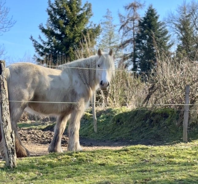 Tinkerstute, wird im April 5 Jahre Stockmaß aktuell ca. 140 cm mit holländischem Pass. Aus persönlichen Gründen sucht unsere Tinkerstute ein passendes neues Zuhause. • aktuell ca. 140 cm (noch im Wachstum) • kompakter Typ • kennt Offenstall und 24/7-Weidehaltung sowie nachts Box und tagsüber draußen • regelmäßig geimpft und entwurmt • Osteopath war im Januar erst da Sie kennt: • Longieren und Doppellonge (Roundpen & Platz) • Gelassenheitsarbeit • Spaziergänge im Gelände • Platzarbeit • Sie wurde bei der Vorbesitzerin in einem Kutsch-Ausbildungsstall ein- und zweispännig gefahren und kennt die Arbeit vor der Kutsche. Laut Vorbesitzerin wurde sie bereits im Abteilungsreitunterricht eingesetzt. Beim Hufschmied ist sie brav. Sie ist aufmerksam, intelligent und arbeitet fein mit, wenn sie klar geführt wird. Im Gelände zeigt sie sich grundsätzlich gut händelbar. Sie ist aktuell kein Anfänger- oder Kinderpferd. Obwohl sie von der Vorbesitzerin (laut ihrer Aussage) als Therapiepferd ausgebildet und eingesetzt wurde, sehe ich sie aktuell nicht in diesem Bereich. Sie ist sehr Menschenbezogen. In einzelnen Situationen im Handling benötigt sie einen ruhigen, erfahrenen Menschen mit klarer und konsequenter Führung. Hier arbeiten wir bereits regelmäßig mit unserem Trainer. Unser Trainer arbeitet regelmäßig mit ihr vom Boden aus zur weiteren Desensibilisierung und Muskelaufbau. Im Gelände ist er sie im Schritt auch bereits kurze Strecken ohne Sattel geritten, was sie sehr ruhig und gelassen mitmacht. Dabei war sie jeweils als einziges Pferd unterwegs. Auch neue Wege und unbekannte Strecken bereiten ihr dabei keine Probleme, sie bleibt aufmerksam und geht ruhig mit. Ein Probereiten ist aktuell aufgrund fehlenden Equipments nicht möglich. Spazierengehen, Longieren und Kennenlernen sind selbstverständlich möglich. Sie wird ausschließlich an erfahrene Menschen verkauft, die den Umgang mit einem jungen Pferd mit Ruhe und Geduld bevorzugen, da sie aufgrund ihres Alters noch weiter lernen muss. Anfragen bitte nur bei ernsthaftem Interesse, mit ein paar Infos über Pferdeerfahrung, zukünftige Haltung und Ihrem Namen. Alles andere wird nicht beantwortet.