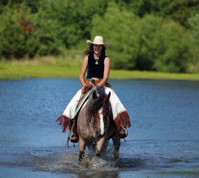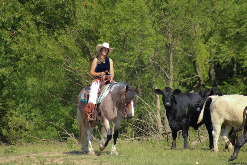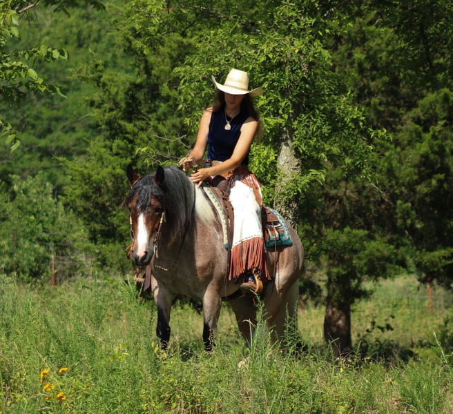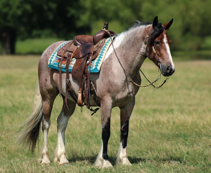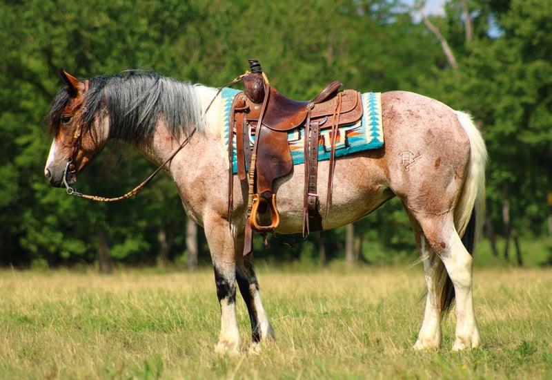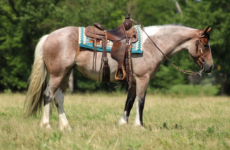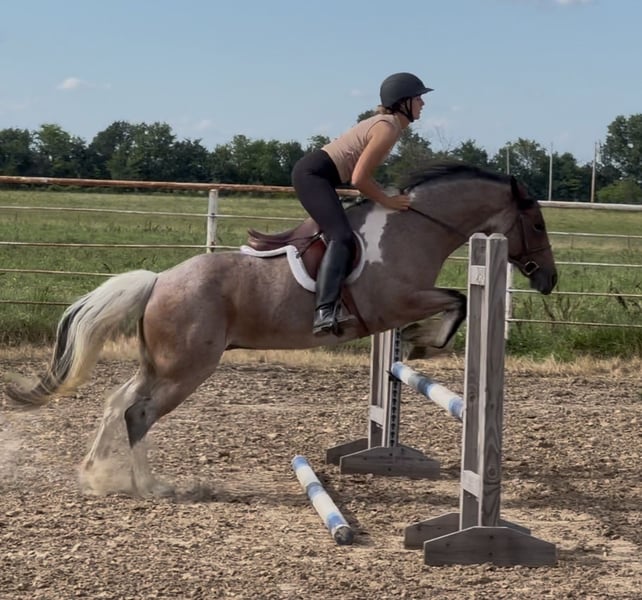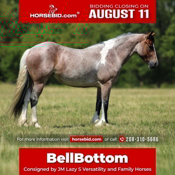 ⚜ The HERITAGE Classic ⚜ Happening now thru MONDAY | AUGUST 11th - Available EXCLUSIVELY on HorseBid's website! For more details and to register visit: www.Horsebid.com CONSIGNOR CONTACT: JM Lazy S Versatility and Family Horses 208-310-5686 LOCATION: Baxter Springs, KS BREED: Gypsy Vanner X Paint REGISTERED: No REGISTERED NAME: BellBottom COLOR: Bay Roan Paint HEIGHT: 14.2 AGE: 5 GENDER: Mare Bell Bottom – Built to Shine, Ready to Work 5-Year-Old Bay Roan Gypsy Cross Mare | 14.2+ hh | Ride & Drive | Ranch, Trail & Arena Savvy If ever there were a horse that could wear rhinestones and work cattle in the same day, it’s Bell Bottom. This bay roan Gypsy cross mare is the full package—style, substance, and a work ethic to match. Standing 14.2 hands with thick silver feathering, a feminine head, and a coat that glimmers with roan highlights, she turns heads wherever she goes. But she’s not just for show—this gal has earned her keep in the dust and the daylight. Bell Bottom has proven herself in real-world ranch work, gathering cattle in rough country, sorting in the sale barn, and loading out trucks with cool-headed confidence. She’s solid, handy, and always willing to show up and give her all. Pressure doesn’t rattle her, and she knows how to keep her feet when things get busy. On the trail, she’s just as reliable—crosses logs, water, brush, and anything else you might come across. She’s seen dogs, pigs, goats, traffic, tarps, flags—you name it—and doesn’t blink. Lead or follow, she’s steady and sure, and she enjoys her time with people. She’s the kind that meets you at the gate, ready for the day. Under saddle, Bell Bottom is balanced, forward, and athletic, with movement that’ll surprise you. She can collect up like something out of a dressage arena or melt into a western jog so smooth it’s almost cinematic. She neck reins, side passes, pivots, carries the flag, and moves off your legs with finesse. She’s got buttons and isn’t afraid to use them. While she’s a standout in western tack, Bell Bottom goes beautifully English as well. She carries herself with forward, uphill movement, stays soft in the bridle, and offers a light, responsive feel in the mouth. Her balance and rhythm make her a joy in flatwork, and she approaches a jump with confidence and enthusiasm. Whether you're trotting ground poles or schooling small fences, she stays focused, willing, and eager to please—making her a fun and versatile partner for riders who want to dabble in multiple disciplines. And yes, she drives too—she's spent two months in driving training and has lots of action in the cart. In pure BellBottom it all comes easy to her and she shows all the potential and talent in the world. She moves with elegance and handles herself with ease, making her just as enjoyable in harness as she is under saddle. Bell Bottom is polished without being prissy—she’s easy to catch, easy to handle, respectful on the ground, and well-mannered for the farrier, vet, and hauls like a pro. She’s affectionate without being pushy, sharp without being hot, and always honest in her try. If you’re after a versatile mare who can do it all and look good doing it, Bell Bottom checks every box. She’s the kind that stands out in a crowd and steps up when it counts. BellBottom is up to date on dental, chiropractic, worming, farrier, and coggins. Please call or text John (208)310-5686, Molly (208)566-3050