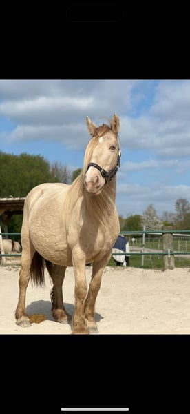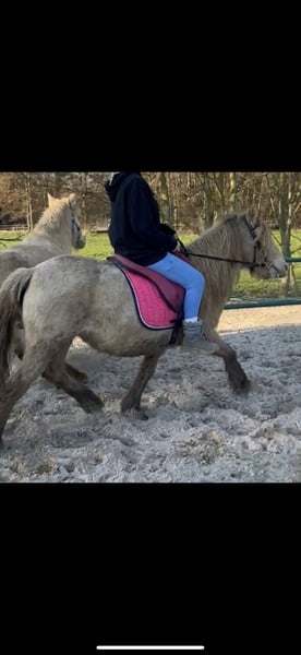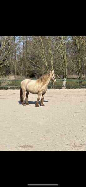 We are offering our friendly Welsh Cob mare for sale – a true gem with a rare coat color and striking green eyes. She is well-behaved, enjoys having her hooves picked out, and is completely accustomed to the farrier and loading into the trailer. The mare is slightly sensitive on her legs but otherwise healthy, ridden, and versatile – suitable for children’s pony riding as well as for breeding, making her especially interesting for breeders. Highlights: - Calm and affectionate demeanor - Ridden and child-friendly - Easy to care for - Farrier- and trailer-loading friendly - Rare color with green eyes – an absolute eye-catcher A wonderful pony for breeding or leisure riding – come and get to know her!