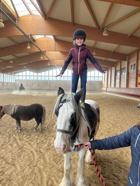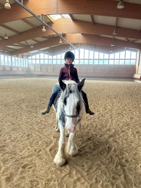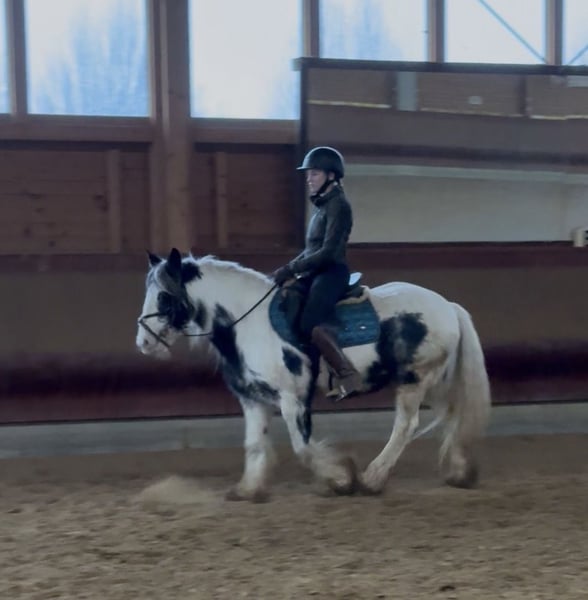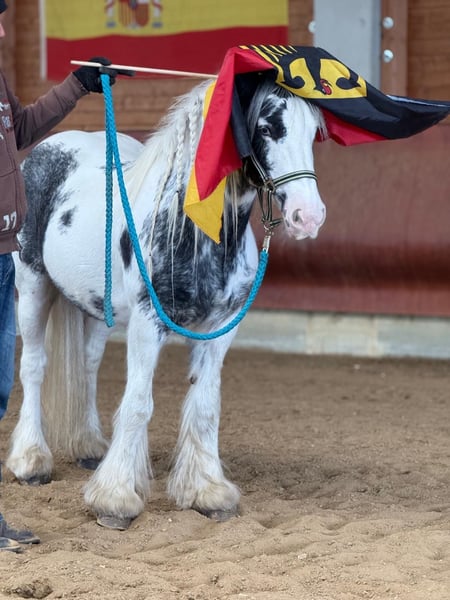 1000%iges FREIZEIT-VERLASSPFERD für ANFÄNGER Du suchst dein entspanntes Seelenpferd? Dann könnte diese liebe und hübsche 7 jährige Irish Cob Stute genau die richtige Begleiterin für dich sein. Mit ihrer hübschen Farbgebung ist sie nicht nur ein absoluter Eyecatcher sondern überzeugt auch mit einem charmanten, liebevollen Wesen, das direkt ins Herz geht. Sie bringt viel Ruhe mit, die sofort Vertrauen schafft, ob in der Halle oder im Gelände. Ein echtes Verlasspferd, das mit ihrer entspannten Art jeden Tag schöner macht. Sie liebt Kinder und ist mit ihnen besonders umsichtig. Unsicheren Reitern gibt sie durch ihre entspannte Art ein geborgenes und sicheres Gefühl. Bei uns lief sie bereits ab und zu im Kinderreitunterricht sowie regelmäßig im Unterricht mit erwachsenen Anfängern. Eckdaten: • Ca. 1,42 m , kräftig, kompakt, stabil & bequem, auch für Erwachsene • Super brav, egal ob Gelände oder Halle, sicher im Straßenverkehr • Verlade- und schmiedefromm • Kennt Offenstall, Box mit Paddock & Herdenhaltung • entspannte Persönlichkeit, dabei zuwendungsliebend & loyal • Inkl. kleine AKU ohne Befund Ein Pferd, das nicht laut, sondern leise begeistert. Eine gute Beratung für unsere Kunden liegt uns sehr am Herzen. Daher planen Sie für einen Besuchstermin mit Vorreiten und Probereiten 1-2 Stunden ein. Für das erste Pferd berechnen wir 35€ , jedes weitere Pferd 20€. Hierfür bitten wir um Verständnis.