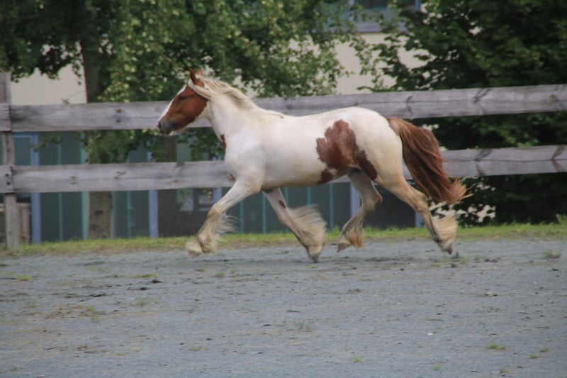 Ausdrucksstarke Irish Cob Stute sucht neue Herausforderung Zum Verkauf steht unsere 9-jährige Irish Cob Stute mit deutschen Papieren und deutscher Zucht. Als Fohlen wurde sie prämiert – ein Qualitätsmerkmal, das sich bis heute in ihrem Gebäude zeigt. Warum sie abgegeben wird: Der Verkauf erfolgt nicht aus der Not heraus, sondern weil sie charakterlich nicht zu unserer Araberherde passt. Leider mobben unsere Araber das sensible Mädchen, weshalb wir ihr eine harmonischere Umgebung wünschen. Ihr Können: Die Stute wurde gebisslos angeritten und beherrscht das Pferde-Einmaleins souverän. Sie zeigt sich unerschrocken und mutig, geht fleißig vorwärts im Gelände ohne durchzugehen und arbeitet auch in der Bahn konzentriert mit guter Selbsthaltung. Durch ihre überragenden Bewegungen eignet sie sich hervorragend für klassisches Reiten oder den Fahrsport. Besondere Qualitäten: Anders als viele ihrer Rasse zeigt sie keine typischen Gebäudemängel. Ihr Rücken ist gut bemuskelt und elastisch, auch im Lendenbereich. Die Halsung ist optimal proportioniert, und ihre natürliche Aufrichtung macht sie trotz ihrer Größe von ca. 140 cm zu einem idealen Damenreitpferd, das auch größere Reiter problemlos trägt. Haltung & Gesundheit: Sie ist sowohl Offenstall als auch Box und Weide gewohnt, läuft barhuf und kommt mit festem Untergrund gut zurecht. Beschlag ist bei Bedarf möglich. Aktuell ist sie durch wenig Bewegung etwas rundlicher als auf den Fotos. Wichtiger Hinweis: Sie kann am Boden bei fremden Personen dominant reagieren und ist daher nicht für Kinder geeignet. Bei ernsthaftem Interesse freuen wir uns auf Ihre Kontaktaufnahme. Gerne können Sie auch mit ihrer aktuellen Reiterin sprechen. Ein Verbleib im gewohnten Umfeld ist nach Absprache möglich. Preis: VB – Qualität hat ihren Wert. Unten genannte Telefon Nummer für WhatsApp verwenden. Danke.