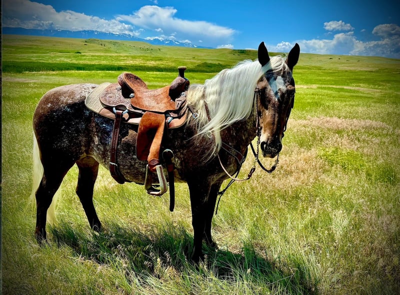 ONLINE AUCTION Place your bids at www.PlatinumEquineAuction.com Starting Bid $3500 Auction ends August 17th, 2025 Need a new saddle? Check out White Rock Saddles on our website or Facebook Curvy young blonde, loves adventure and long walks, seeking like-minded life partner… Here is a horse of a different color! Donna is an 8-year-old chocolate palomino roan mare, with curves in all the right places, and a temperament as sweet as honey. Donna stands 14.3 hands and is about 1100 pounds, with tons of foot and bone. She’s built to go anywhere and last forever. She sells grade, and your guess is as good as mind on her breeding; with big round feet and feathers, I suspect she’s a crossbred, but she’s sensitive to pressure and moves off the leg like a Quarter Horse, and that mane and tail are 100% Gypsy. Throw in some Appaloosa speckles or maybe Rocky Mountain Horse coloring, and she’s a real Heinz 57. Donna has impeccable ground manners. She bathes, clips, loads, ties, and is great with her feet. She was originally started in an English discipline, so she has some nice collection and the smoothest transitions you’ll ever feel. Then she got a job at a dude ranch, where she primarily worked in the children’s lesson program. She is an absolute angel with children, sweet and patient, and oh-so-forgiving. She has been exposed to tarps, dogs, goats, chickens, cattle, four-wheelers and all the chaos that comes with kids. Far from a deadhead, she’ll lope right off and pick up the pace when asked. In the arena, Donna knows both her leads and lopes pretty circles. She has a soft jog you can sit all day, and a gentle rocking-chair lope that’s sure to have you grinning from ear to ear. But outside of the arena is where Donna really shines. She LOVES a trail ride, and strides right out at a nice clip. She’ll lead, follow, and is happy to go out alone. Hop on her bareback to go check the cattle, or load her up for an overnight adventure with friends. She’s just happy to get out in the sunshine with you. Donna is 100% sound and sane, with no vices. She stays pleasantly plump on grass, and doesn’t have any blemishes. She’s up to date on shots, wormer, teeth, and feet. She has only ever known good care. She was barefoot all year, but I just got her shod all the way around for her sale. She’s legged up and ready to meet that special someone! Is it you? Located in Fishtail, Montana. Not available for private sale outside of this auction. Contact Melissa Kepler for more information: 303-877-9151. ONLINE AUCTION Place your bids at www.PlatinumEquineAuction.com Starting Bid $3500 Auction ends August 17th, 2025 Need a new saddle? Check out White Rock Saddles on our website or Facebook