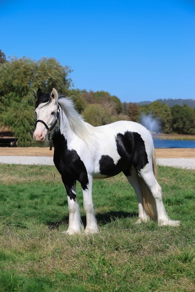 Nacho is an unbelievably chill boy ready to head in any direction. He bathes, ties, good for the farrier. He hasn't needed a clip but probably won't care either way. **TGCA ELIGIBLE** !!This boy would be an ideal candidate for therapy work!! He has a heart full of love and just follows you, no questions asked. He has less feather than our other horses so if you are looking for the Gypsy character and temperament without a lot of the grooming work, Nacho is your guy! Drive him, ride him, your call; he will do it all. He is son of the world famous SD Little Stevie.