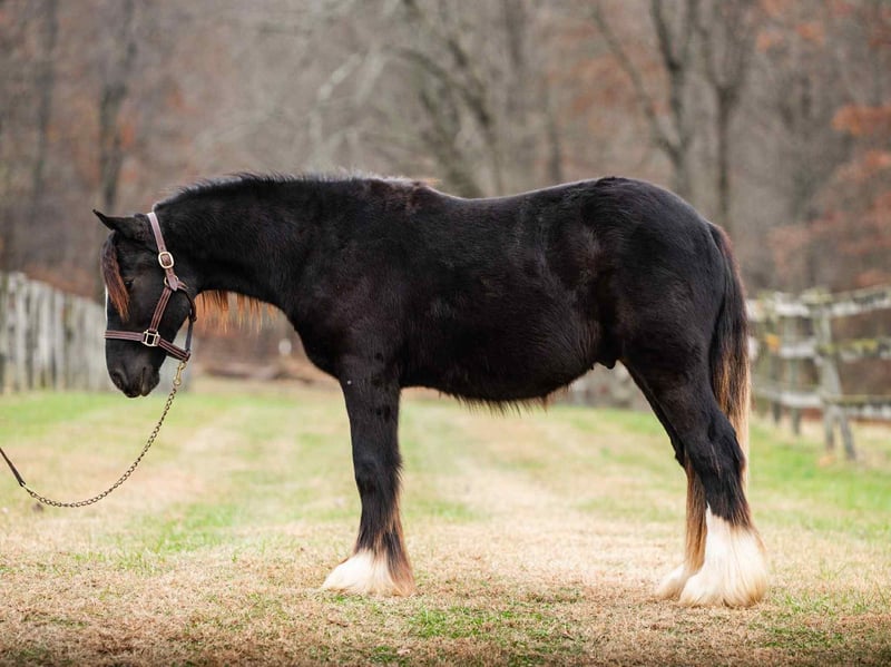 "AVAILABLE ON ONLINE HORSE AUCTION AT www DOT MagicHorseAuction DOT com BIDDING OPEN NOW thru TUESDAY | December 9TH! - BUY IT NOW AVAILABLE! *Final price will be determined on auction site* CONSIGNOR CONTACT INFO: Roni Renee Turner 610-806-2613 LOCATION: New Holland, PA “Leafy Lane Slim Shady” aka “Shady”, is a registered Gypsy Vanner colt, foaled on April 16th 2024, currently standing 13hh, who already owns a lush mane, tail, and feathers. If you are looking for a phenomenal brain, wonderful conformation, great breeding, and the looks to pair, here is your guy. Not only is Shady as friendly as they come, he has a very calm demeanor and an old soul. This boy was quite literally “born broke”. I really cannot say enough of good things about Shady, he is going to make the perfect partner for someone who is looking for a loyal and gentle friend. In the barn, Shady has zero bad habits. He can live in or out, goes out with others happily and has zero bad stall habits. He is quiet in his stall, neat, and never complains or asks for anything. He can live out 24/7, he does not mind either way. Shady will always be the first one to greet you, he will follow you around like a puppy dog and loves attention. He cross ties and straight ties. Shady will stand on the cross ties all day long to be groomed, braided, loved on, you name it. He stands to be bathed as well. Shady is safe for absolutely anyone to work around. He is very gentle and safe for kids and beginners to work with. He doesn’t mind my rowdy dogs running all around his feet. He picks up his feet and is good for the farrier and vet. A crazy busy barn is not frightening to Shady, it is amusing and he will just sit there and chill and watch all of the commotion. Shady has excellent ground manners. He can be fully handled, led, caught, etc by beginners and children. He has had extensive ground work, and he was raised correctly. Shady has gone on hand walks through the woods, through trail obstacles, through water and fields, he is going to be an amazing trail partner in the future. The brain that this young man has, is just not comparable. Shady lunges, and listens to voice commands. He has been tacked several times and never once had a reaction. We have started him on ground driving as well; and again he caught right on and did what was asked. I don’t know if I have ever been around such a teachable yearling!! Shady has been through lots of desensitizing. He takes everything in stride and is pretty much unfazed by all of our crazy antics. He will walk over a tarp, even with it blowing right at him and getting caught on his legs. He doesn’t mind if the tarp is flapping 15’ in the air. He will play with a big ball, and doesn’t mind it being on or around him. We have waved a large flag all around him, he didn’t mind. He follows the wagon with a little “pony” in it, and was much more interested in eating the hay inside of the wagon lol. Atvs and other machinery? Traffic? No problem, he chases the Ranger in the pasture to catch us for hay. Lead him from the four wheeler. Dogs running all over? He doesn’t care. Cows? Cows are friends. Shady has also been introduced to trail obstacles such as walking through pool noodles, over ground poles, over flower boxes and even jumped a few cross rails in hand. He loads and trailers well, with or without company. Shady is going to be easiest guy to start, the hard part is done, here is a horse that is ready to start your way, and be your forever partner. Shady is sired by a stallion named “Monashee Toy Story”, a strapping sire who is beautiful marked. Also known as “Buzz” is considered a mini-Gypsy. He attended the 2023 Gypsy Vanner Congress and is known for his good demeanor and athleticism. Shady’s dam is named “Wellington Kenai”, who is a spitting image of Shady, with great conformation, big bone, and wonderful hair. She is a regular sized Gypsy. Shady is expected to finish at around 14.1-14.2hh. On his Sire’s side, the name “North Star Maestro” will be found, who is a significant representative of the GVH breed, possessing some of the best GV bloodlines. Shady’s top side also goes back to the famous “Bob The Blagdon”. On Shady’s bottom side, he goes back to “Romany King” and influential stallion known for his conformation, amazing temperament, and wonderful movement. Romany King earned a five star evaluation by the GVHS. Slim Shady has excellent breeding, in which has created an amazing all around yearling. Whether you are looking for an all around gelding or a herd sire, these bloodlines speak for themselves. Shady is PSSM1 n/n, FIS n/n, and a/a, E/e, N/W20. Here is a colt that is currently set up to head in absolutely any direction. He has been so wonderful to work with, teach, and have around. Shady is very intelligent, and loves to learn. I would love to have the opportunity to follow this boy and watch him grow and learn, I am very fond of him, the whole barn is. And while I would love to find him his forever person, I am not pressed to sell him, as I just know that he is going to be amazing and very easy to bring along. Please take the time to watch Shady’s full video to get a feel for the type of wonderful guy that he is. Please feel free to reach out for any further information. Shipping can be arranged anywhere.