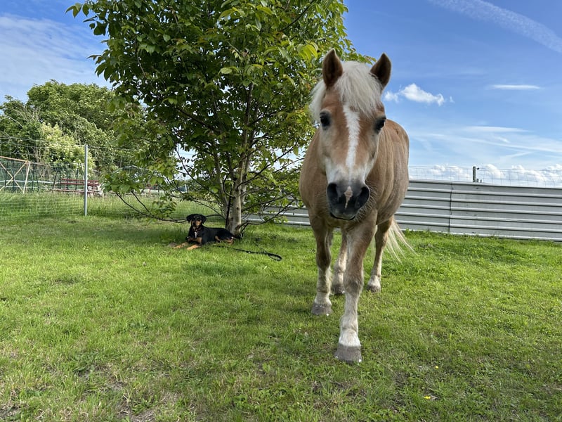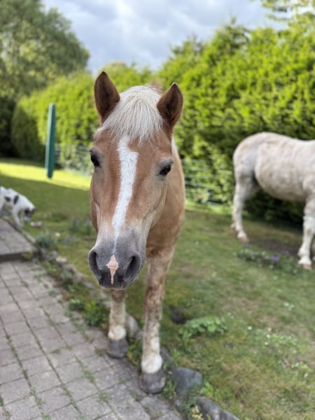 Verkaufe Haflinger Wallach – Perfekt für die Freizeit! Zum Verkauf steht ein hübscher, hellbrauner Haflinger Wallach, geboren im Jahr 2010. Mit einem Stockmaß von 136 cm ist er ideal für Freizeitaktivitäten und bietet viel Freude für Reiter. Sein freundliches Wesen und seine zuverlässige Art machen ihn zu einem treuen Begleiter im Alltag. Ob Ausritte, Spaziergänge oder entspannte Stunden im Gelände – dieser Haflinger ist vielseitig einsetzbar und begeistert durch seinen lustigen Charakter. Er macht wahnsinnig Spaß und liebt Abwechslung, er ist nicht das typische „lahme“ Pony, er hat Spaß am Go! Merlin ist PPID positiv, heißt ECS-Cushing, was ihm aber absolut nicht im Wege steht. Wir haben ihn vor gut einem Jahr „rausgekauft“, ihn komplett durchchecken lassen: -geimpft -gechipt -Zähne gemacht -Blutbild (PPID positiv) Er ist eingestellt, Fütterung und Haltung optimiert und schon blüht er endlich verdienterweise auf und genießt sein Leben. Leider hat die Vorbesitzerin uns verschwiegen, das er noch als Hengst mit in ihrer Herde stand und hat zusammen mit seiner Herzensstute ein Fohlen. Was davor war können wir nur mutmaßen. „Leider“ ist er bereits sein Leben lang mit dieser Stute zusammen, welche wir ebenfalls „rausgekauft“ haben und entsprechend klebt er total an ihr. Da wir allerdings auch unsere Herde erweitert haben, funktioniert das nicht so gut, da er „seine Stute“ extrem verteidigt. Er bringt Unruhe in die Herde und hat selbst sichtlichen Stress, was totaler Unsinn ist aber er kann leider nicht davon ab. Darum haben wir lange und intensiv darüber nachgedacht und uns schmerzlich dazu entschieden für den tollen Kerl einen neuen Wieklungskreis zu finden. Er hat es verdient, er möchte gearbeitet werden! Ansonsten ist er ein super sozialer, verträglicher Wallach-sofern „seine Stute“ nicht dabei ist. Er stand bereits bei den Nachbarn in der Herde ohne jeglichen Stress oder Terror. Denn eigentlich ist Merlin ein super sympathisches Pony. Bei Interesse oder für weitere Informationen stehe ich Ihnen gerne zur Verfügung.