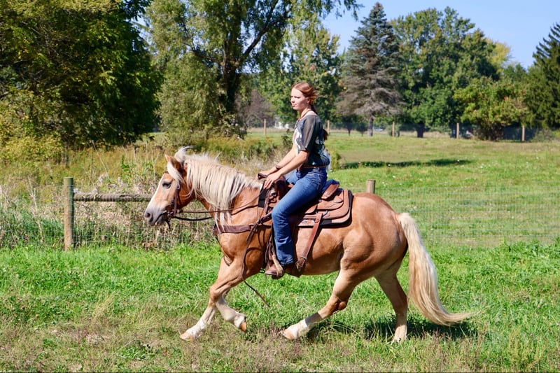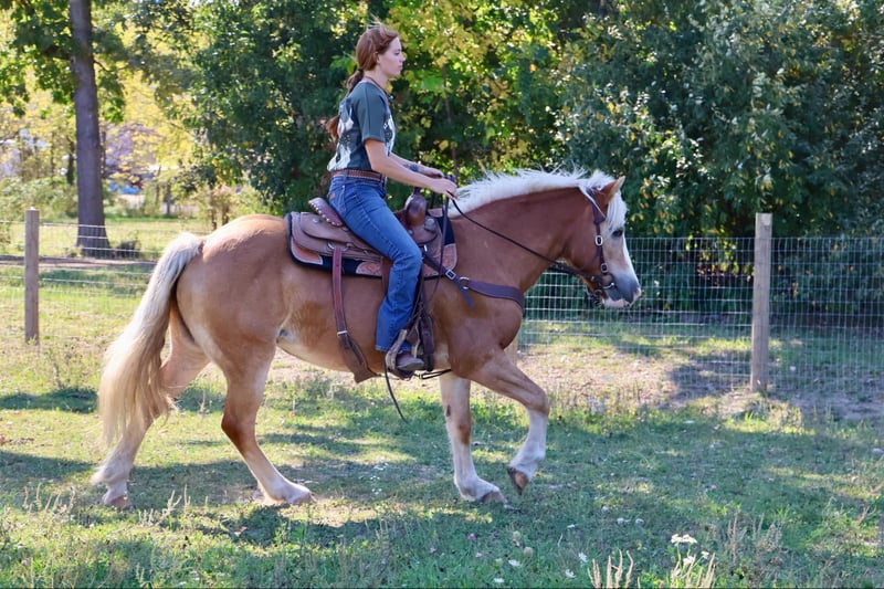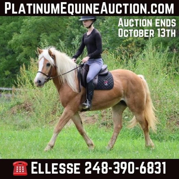 ONLINE AUCTION Place your bids at www.PlatinumEquineAuction.com Starting Bid $3500 Auction ends October 13th, 2024 Need a new saddle? Check out White Rock Saddles on our website or Facebook! Meet Minnie, she is an all-around user-friendly happy-go-lucky kind of girl! This girl is loaded with personality. She is light chestnut with an amazing double mane and a gorgeous tail. She stands a solid 14.1hh at 13 years old. She has great bone structure and solid hooves. This girl is put together beautifully. Minnie is one of the most docile haffies you will meet. She has been trained with natural horsemanship methods. Minnie knows how to say yes and no, and will ride around with a simple halter and rope. She will stand tied anywhere you want to tie her for grooming pampering and to be loved on. She has been used in countless grooming and tacking lessons for some very beginners as she is patient and loves attention. She loves a good bath and will stand and let you blow dry and braid her beautiful mane and tail. Minnie has been used for tons of trail rides and she loves adventures. Minnie has been hauled all over the Midwest and is no stranger to woods, water, wildlife, traffic, bicyclists, and any other obstacle you may encounter on a trail. She has been ridden out in the field and down the road. She is more of a slow and steady girl who will take her time soaking in the scenery. She loves teaching kids and beginners as she has a very calm and kind demeanor. She has been used in kids’ camps doing arena work. She will walk, trot, and canter on both leads. She comes equipped with Stellar gaits, as she’s one of the most comfortable haffies you will ever sit on. She will stop on a dime and stand patiently. She has been ridden by up to 3 kids at once and has no problem. She is the ultimate family horse as she’s big enough to carry a full-size adult or several children all at once but yet she’s kind enough to take care of some of the tiniest riders. She is a confidence-building type. Minnie lives outside with other horses and she plays very well with them. When you walk outside she’s always one of the first to greet you at the pasture gate. Shes a very easy keeper. Minnie has been in several parades, she has carried a flag, been in commotion and loud noises don’t phase her a bit. She is also broke to drive and will do so single or double. She has been working with Mickey for years and the pair of them are absolutely beginner friendly in any situation. They will work together or single. Shes been down the road, and in the field! Minnie has endless possibilities. She could be a best friend for any family she could fox Hunt, play in pony club, cart classes, show in any laid-back Discipline such as equitation showmanship Trail obstacle or even a Hunter under-saddle. She is correct in every ways and has demeanor to match. Please call or text Ellesse Schwartz for more information 248-390-6831. Minnie lives in Howell, MI 48855. ONLINE AUCTION Place your bids at www.PlatinumEquineAuction.com Starting Bid $3500 Auction ends October 13th, 2024 Need a new saddle? Check out White Rock Saddles on our website or Facebook!
