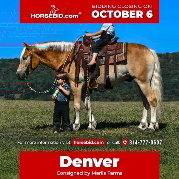 🍂 𝓐𝓾𝓽𝓾𝓶𝓷 𝑨𝑳𝑳 𝑺𝑻𝑨𝑹 𝑳𝑰𝑵𝑬𝑼𝑷 🍂 Happening now thru MONDAY | OCTOBER 6th - Available EXCLUSIVELY on HorseBid's website! For more details and to register visit: www.Horsebid.com CONSIGNOR CONTACT: Marlis Farms 814-777-0607 LOCATION: Rebersburg, PA BREED: Halflinger REGISTERED: No COLOR: Blonde HEIGHT: 14.1 AGE: 4 GENDER: Gelding Denver is a 4 year old 14.1h Haflinger gelding. Denver is a super sweet, laid back and easy going gelding that loves to trail ride and would make an excellent kids step-up mount or husband horse! Denver rides western and English and loves to jump! He would be the perfect addition to someone’s lesson program or as an all around family horse! In the ring, Denver is very simple and easy to ride. He has a very comfortable walk, trot, canter and has smooth transitions. He has been started over fences and took right to it! We have had all levels of riders on Denver, he is enjoyable for everyone! Off farm, Denver will ride out alone or with a group. He is safe for anyone to hit the trails on and takes care of his rider! Denver is traffic safe, he will cross over deadfall, rocks, creeks, bridges and doesn’t care about bikes, dogs, wildlife etc! He is a very relaxing, simple ride! At home, Denver loves attention and is very friendly. He has good ground manners and is easy for the vet, farrier and dentist. He stands good in cross ties, he’s good to bathe, clip, groom, tack up etc! He does well in a stall or can be turned out in a mixed herd! He stays lower on the pecking order and is easy to catch from the field! Denver requires no maintenance or supplements, he is an easy keeper and he sells sound with no known vices! Feel free to reach out with any questions or to set up a visit to meet Denver!