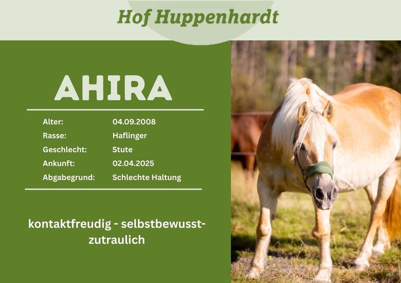 Wir suchen ein neues Zuhause für unsere Haflingerstute Ahira. Die am 04.09.2008 geborene Stute wurde von uns im Frühjahr 2025 aufgenommen, da die Besitzerin sich nicht mehr um sie kümmerte. Bei uns zeigt sie sich aufgeschlossen, neugierig und kontaktfreudig. Sie steht bei aktuell in Boxenhaltung und genießt die Weidezeit mit einer großen gemischten Gruppe. Sie ist eher ranghoch, verschafft sich gerne Platz in der Gruppe. Laut Vorbesitzer wurde Ahira geritten, auch von Kindern. Wir haben bis jetzt nur gemütliche Schritt-Ausritte getestet, dies meistert sie mit Bravour! Ahira ist Menschen gegenüber aufgeschlossen, lässt sich überall berühren und fasst schnell Vertrauen. Manchmal ist sie etwas distanzlos und braucht klare Grenzen und Aufgaben. An den Vorderbeinen hat sie ausgeprägte Gallen, die sie in der normalen Bewegung nicht beeinträchtigen. Beim Hufe auskratzen zwickt es, vermutlich durch begleitende leichte Arthrose, manchmal etwas. Wir wünschen uns für sie ein neues Zuhause mit eigenen Menschen, wo sie das Pferdeleben richtig kennenlernen kann. Wir sind ein Tierheim für Großtiere. Alle unsere Schützlinge werden nach positiver Vorkontrolle und gegen eine Schutzgebühr vermittelt. Gerne können die Tiere nach vorheriger Terminabsprache bei uns auf dem Hof besucht und kennengelernt werden.