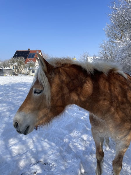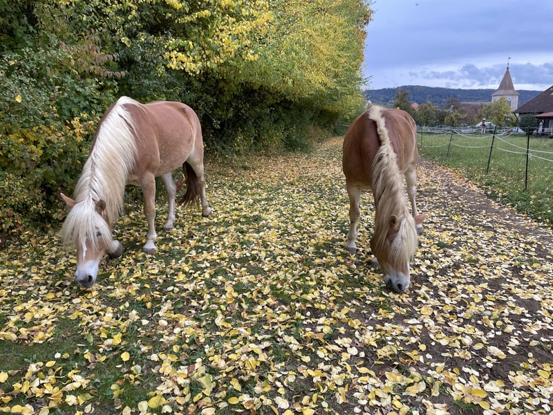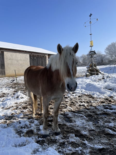 … mit keckem Charakter und tollen Gängen im modernen Reitpferdetyp, die sich hier tierisch langweilt, sucht ebenbürtigen Partner für gemeinsame Abenteuer. Wegen Aufgabe der Pferdehaltung schweren Herzens in gute fördernde Hände abzugeben, wo sie viel bewegt werden. Wir würden gerne beide zusammen abgeben. Da sie doch sehr unterschiedlich sind und wir für beide einen guten Platz suchen, ist auch Einzelkauf möglich. Dazu müsste man sich abstimmen, dass sie gleichzeitig den Stall verlassen, da wir haben keine weiteren Pferde haben. Beide durften ihre(n) ersten Sommer auf der Alm verbringen. Wir kauften sie im September 21 als Absetzer/Jährling von einem Tiroler Züchter (Nähe Ebbs), gewöhnten sie langsam ans Reiten, machen viel Boden- und Freiarbeit. Sie sind nun nach rund 4 1/2 Jahren liebevoller Offenstallhaltung bei uns am Bauernhof bereit für die weitere Ausbildung. Sie kennen Kinder, Hunde, landwirtschaftliche Fahrzeuge, Radfahrer, etc, Im Sommer bei vereinzelten Spaziergängen / Schrittausritten zeigten sie sich entspannt. Malena 5 Jahre, mit „Schnäuzel“: quirlig, frech (noch etwas unerzogen), schlau, aufmerksam, braucht jemanden, der sich von ihrem anfänglichen Gezicke nicht beeindrucken lässt, und regelmäßige Bewegung, kennt Reitergewicht im Schritt, Trab, Galopp. Man muss noch in der Mitte stehen (wurde aber seit gut einem Jahr kaum geritten und nur von unten bewegt, da ich eine langwierige Knieverletzung durch ein fallendes Scheunentor hatte und seit Mitte März frisch operiert bin) Raumgreifende federnde Gänge, wäre auch gut im Sport aufgehoben eher rangmittig, sucht schnell einen Kraulpartner, sehr intelligent, möchte Entscheidungen (mit-)treffen, dennoch Guter Teamplayer wenn man ihr Vertrauen gewonnen und ihren Hafi-Sturkopf überzeugt hat, Möglicher Schwerpunkt: Freizeit, Dressur, Fahren, Zucht. Sie sind sehr menschenbezogen und zutraulich, lieben es geputzt/gekrault zu werden. Malena, unser Prinzesschen, zickt anfangs gerade beim Putzen gerne (wehe du kraulst mich nicht an meiner Lieblingsstelle, da hab ich sie wohl etwas verwöhnt), ist aber händelbar. Sie können aber auch ihr Jungpferde-Temperament rauslassen. Bei regelmäßigem Training sind sie ausgeglichen und sehr sportlich. Mit ihrer Abstammung eignen sie sich auch gut für die Zucht. Für Malena ist reine Offenstallhaltung ungünstig, sie braucht v.a. um die Dämmerung einen Rückzugsort vor den Fliegen und viel Pflege, was sie in letzter Zeit bei uns zu wenig hatte. Sämtliches Zubehör kann, falls gewünscht, günstig mit erworben werden. Wir hoffen, es finden sich die richtigen Menschen. Bei ernstem Interesse gerne melden! Bettina