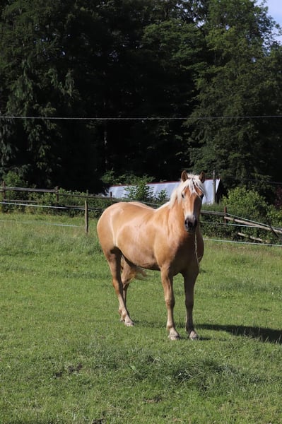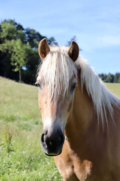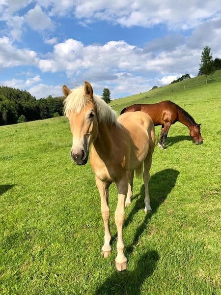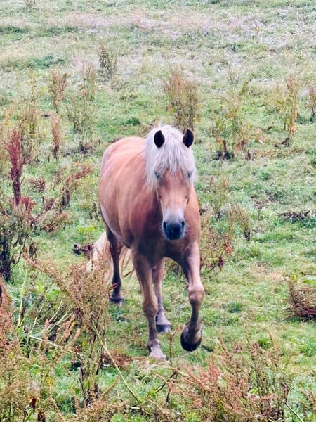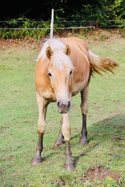 Elara - Haflinger mare - Born on April 24, 2019 - Originally a slaughter horse, came to us at 7 months old - Very people-oriented and affectionate, with typical Haflinger traits - Not suitable for riding - Overweight - Currently living in 59757 Arnsberg - A personal meeting with Elara is a prerequisite Elara came to us at 7 months old and immediately showed herself to be extremely people-oriented and eager to learn. We developed a very close bond, and she would follow me everywhere without a halter. An absolute dream foal. Unfortunately, we increasingly noticed that she became overly dependent on humans, and socialization with other horses was rather challenging, as she was very insecure around her peers. Around her first year, I moved her to a wonderful nursery herd where she was well socialized. She now lives in a large herd with mares of all ages—from foals to retirees. In summer, they spend 24 hours on vast pastures with woods and streams; in winter, they are in an open stable. She was kept there for the first three years (farrier, veterinarian, etc. naturally part of her routine). When she was about four years old, the owner of the stable (Elara’s foster mother) began working with her. She displayed typical Haflinger characteristics: she has her own mind and ideas. We affectionately call her “Pommespanzer” (French: “Croque-Monsieur”). Despite this, they achieved a lot together. Elara was very willing during groundwork and also under saddle, and she handled riding well. She moved confidently and happily in groups, both in the terrain and on the arena. Unfortunately, it quickly became apparent that tight turns caused her discomfort. We had her checked and adjusted her training accordingly. Suddenly, she started to lameness severely, which led us to have her X-rayed. The diagnosis: horn column issue – front right (surgery was not recommended). Due to this diagnosis, she is NO LONGER RIDEABLE. Tight turns cause her difficulties, and rocky ground is problematic for her. In 2023, 2024, and 2025, she suffered from hoof abscesses (sometimes front left, sometimes right), but thanks to her foster mother’s quick and proper care, these healed well. Due to her condition, proper hoof care is essential. Elara has very flat soles. All X-ray images are available, including those of her hoof issues. She does not need special shoes (she is barefoot) and can lead a normal life. Weight reduction would be very beneficial for her and her hooves. Elara manages well with this, and there are no increased costs involved. Elara has her own ideas and tries to enforce them. Respect must be earned, and she responds best to fair, consistent handling. Farrier visits go smoothly, and she has shown herself to be a little star during loading training. We are exclusively looking for a lifetime/end placement! She will be rehomed with a protection contract.