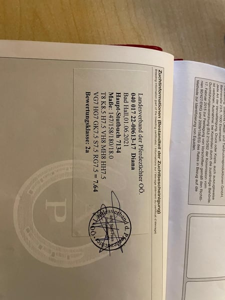 Diana’s dam is the premium mare Donaufürsten (by Nestroy), and her sire is the well-established Steinkogel. She is also registered in the 2a studbook (see notes in the photo), making her an interesting prospect for breeding.