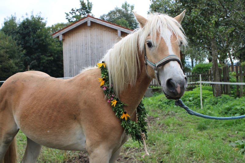 Stallion Update: March 11, 2026: Hooves trimmed — was a bit ticklish; now has a thick mane. January 8, 2026: Hooves cleaned and dewormed without any issues; height at 140 cm. Haflinger Yearling, born April 27, 2024; correct conformation, final height at a minimum of 150 cm; friendly, lovable, balanced, curious, and people-oriented; nice walk, smooth trot; well-behaved during hoof care, loading, and deworming; we are seeking a good home for him because he is a nice, intelligent, and well-behaved colt; from pedigree, he has the potential for breeding. - Achieved an overall score of 8.5 at the "Bavarian Foal Championship 2024" in Munich. He grew up between a main road and a railway, exposed to street noise, sirens, and helicopter overflights. Spent the summer on the stallion pasture; now has a double mane; was one of the larger yearlings; currently housed with a gelding, and they get along very well; he is quite lively and active; there is the possibility to bring him back to the pasture for the summer.