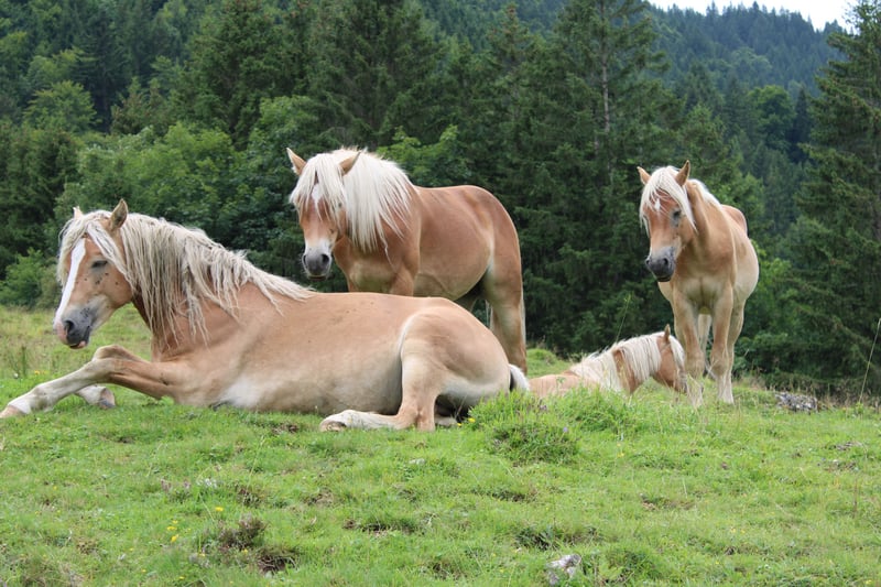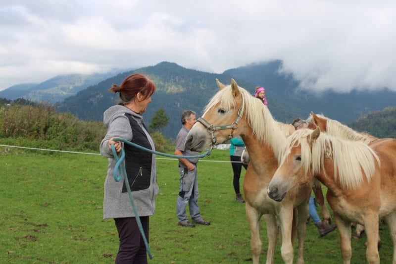 Haflinger-veulen, geboren op 27 april 2024; correcte hengst met een verwachte eindhoogte van 150 cm; vriendelijk, lief, evenwichtig, geïnteresseerd en sociaal; rustige type, mooie stap, braaf bij het hoefonderhoud; probleemloos laden en ontwormen; op papier heeft hij de vereisten voor de fokkerij; zijn moeder heeft hem op 10 maanden gespeend; ook als ruil tegen merrie; - momenteel op de hengstalm; komt waarschijnlijk in september terug; - heeft een totale score van 8,5 behaald bij het "Bayerisch Fohlenchampionat 2024, München"; - is gewend aan straatgeluiden, inclusief sirenes, helikopter- en treinlawaai; Hier een paar indrukken van de alm (30.07). Het heeft dagenlang geregend... dat is te merken aan de paarden; het is een groep van voornamelijk 2-jarigen en enkele veulens; de oudere zijn donkerder, de jongere lichter; vandaag was ik weer boven... stemming beter, de dunne, lichte zijn veulens, de donkere, gespierde zijn 2- tot 3-jarigen;