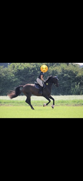 Dear gelding, due to a lack of time and my own horse breeding, is being offered to the best hands. He is familiar with trail rides, riding vacations, and drag hunting. In the field, he is cool but attentive, not flighty. Easy to handle. We have now started jumping with him. He does it great. He nicely tucks his legs away and has a fantastic pace for courses. No refusals, not spooky. I envision him with an ambitious rider who enjoys trail rides just as much as course training. A great leisure partner with potential in show jumping. Very well-mannered, gentle, but still needs loving, consistent guidance. No inquiries from complete beginners, riding schools, or vaulting. The horse has been in our possession for 5 years. Never sick, lame, or anything like that.