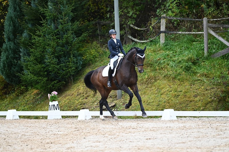 Simsalabim ist ein absolutes Traumpferd. Stets motiviert und engagiert, macht er sehr viel Spaß in der täglichen Arbeit. Ausgebildet und platziert bis zur Klasse L**. Mit fliegenden Wechseln wurde begonnen. Zudem geht er sehr gerne ins Gelände und freut sich auch über den ein oder anderen Sprung. Aufgrund einer minimalen Verletzung am Fesselträgerursprung war Simsa nach der Behandlung (Schrittprogramm + Stoßwelle...) noch 14 Monate auf der Koppel. Seit März 2025 wurde er behutsam wieder aufgebaut und ist seit Juni wieder voll im Training. Jüngst erfolgreich am Turnier vorgestellt. Wir wünschen uns für ihn ein Zuhause mit täglichem Koppelgang bzw. viel Paddockzeit. Auch eine Haltung im Offenstall können wir uns für Simsa gut vorstellen. Er ist eher ranghoch, immer aufgeschlossen und lieb anderen Pferden gegenüber. Ausgezeichnetes Heu rund um die Uhr ist essenziell. Simsa ist aufgrund seiner Größe und seiner sportlichen Einstellung KEIN Anfängerpferd. Er zeigte bei uns keinerlei Unarten, jedoch verfügt er über viel Schwung und ein angenehmes GO. Man sollte zumindest über einen losgelassenen Sitz verfügen, um viel Freude mit ihm haben zu können. Nähere Infos gerne per WHATSAPP: +436502819590