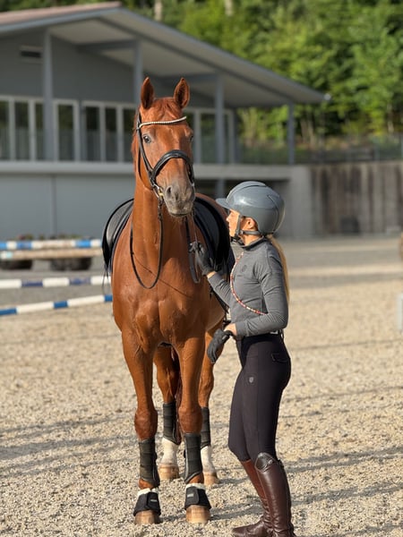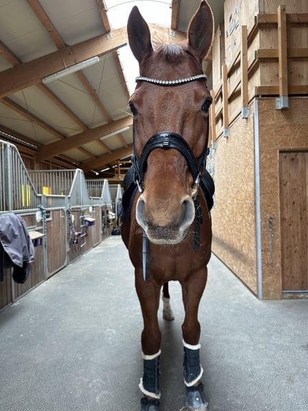 Our beautiful dressage gelding from 2012 is for sale. "Baldassarini" comes from the renowned dressage breed Wieghaus-Vorwerk (Belstaff x Dancier). He was licensed as a 3-year-old and subsequently laid. Balu is a guarantee of fun in his daily work. He is very fine to ride in dressage, wants to please and has an absolutely ambitious sportsman's attitude. He is at a solid L/M level, but if the rider has the appropriate knowledge, he can also be called up for all M level lessons (potential for more is clearly available). Balu came to me from his first owner 2 1/2 years ago. However, I have to admit to myself that we have simply not become the team I would have wished for. The main reason for this is that Baloo wants to be challenged (in a varied way) every day. We don't have the infrastructure for this in winter. He is not a beginner's horse and needs a confident, ambitious rider. In everyday life and in training, he is the perfect training horse and absolutely lovable (can also be handled by children). He tends to become anxious in unfamiliar situations and requires clear, emphatic leadership and the safety of his rider. An AKU from 06/22 including x-rays are available. Balu has a sound that does not restrict him in any way. We inhale as a precaution, which we would also like to recommend to new owners. Balu goes out in pairs without any problems. Alone, he needs the safety of his rider. He has already been in cross-country training, knows how to be worked from the ground and also jumps well. He has no problems with walkers, treadmills, loading etc. For sale only to the best place and only if you like him. Easy to reach via Whats App, 0041 79 277 76 21.
