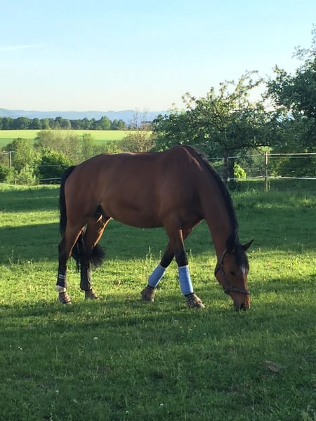 Wallach I 15 Jahre I ca. 1,66m I Hannoveraner aus Herzensdieb x Dacaprio Aus Zeitgründen verkaufe ich meinen fünfzehnjährigen Wallach, den ich selbst ausgebildet habe. Er ist ein absolut liebenswürdiger, ehrlicher Partner der jeden Tag aufs neue einfach Spaß macht. Ausbildung: Sicher auf M-Niveau in der Dressur. Die letzten Jahre habe ich ihn aber nicht mehr auf Turnieren vorgestellt. Turnierstarts sind möglich, sollten aber nicht an erster stelle stehen. Springen haben wir immer nur zum Spaß gemacht. Hier ist er aber sehr motiviert und hat Freude daran. Charakter: Im Umgang absolut unkompliziert und menschenbezogen. Im Gelände ist er eine absolute Lebensversicherung sowohl in der Gruppe als auch alleine. Er lebt aktuell in einem Offenstall mit täglich 8 Stunden Weidegang. Boxenhaltung ist auch möglich. allerdings sollte er dann tagsüber viel draußen sein. Er koppt leider, hat dadurch aber keine Probleme und in der Offenstall-Haltung kommt es kaum zum tragen. Ich wünsche mir für ihn ein liebevolles Zuhause, wo er die Aufmerksamkeit bekommt, die er verdient. Ideal wäre ein Reiter oder eine Familie, die ein sicheres und gut ausgebildetes Freizeitpferd suchen. Er wird nur verkauft wenn wirklich alles passt. Bitte nur ernst gemeinte Anfragen.