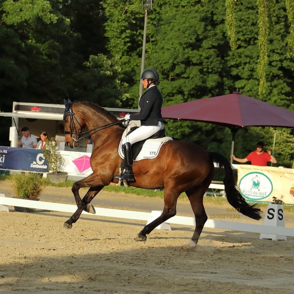 Very well-behaved and uncomplicated 14-year-old gelding. Multiple winner in medium-level dressage competitions. Currently placed several times at S* level. Healthy, up-to-date veterinary examination with no findings. A very friendly horse that is approachable and affectionate towards people.